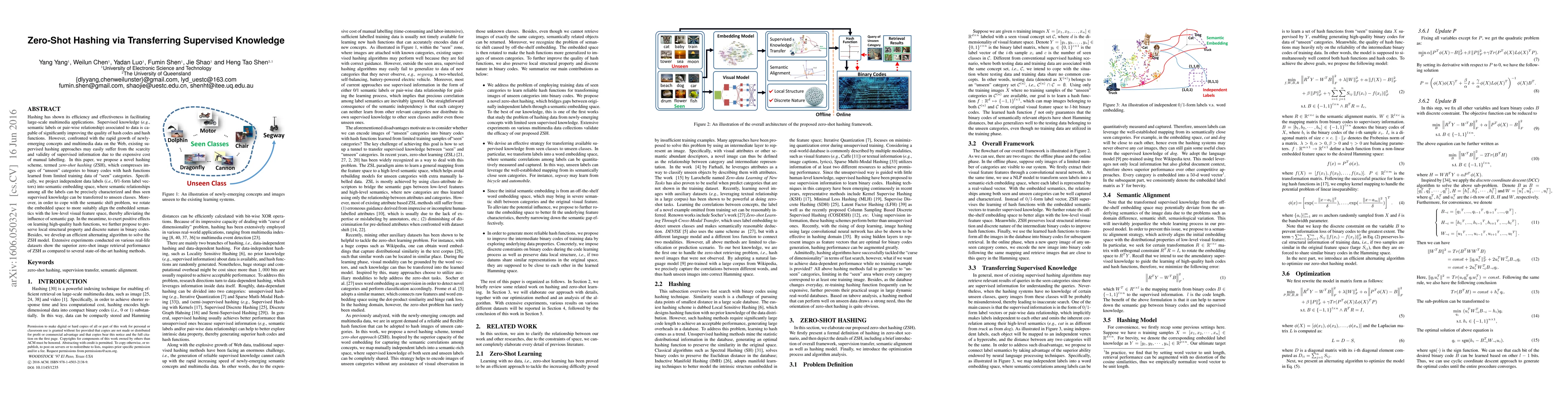 This paper proposes a novel zero-shot hashing (ZSH) method to generate binary codes for unseen categories using supervised knowledge from seen categories. It leverages semantic embeddings to transfer knowledge and addresses semantic shift through space rotation, while preserving local structure and discreteness in binary codes for high-quality hash functions.