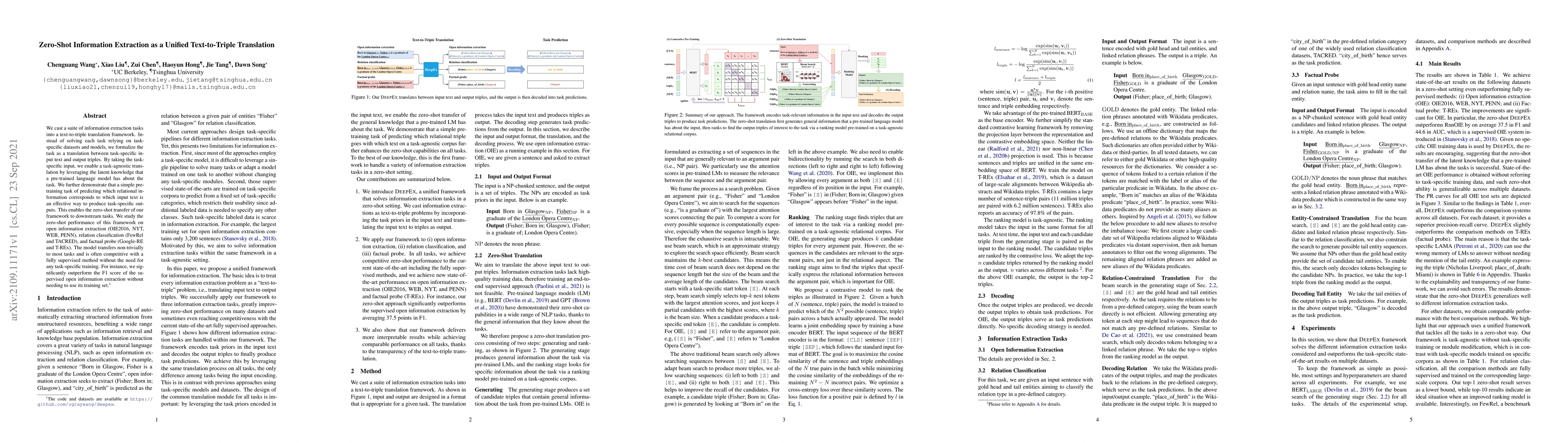 This paper proposes a text-to-triple translation framework for zero-shot information extraction, leveraging pre-trained language models to generalize across various information extraction tasks without task-specific training. The approach achieves competitive performance on multiple datasets, demonstrating effective zero-shot transfer.