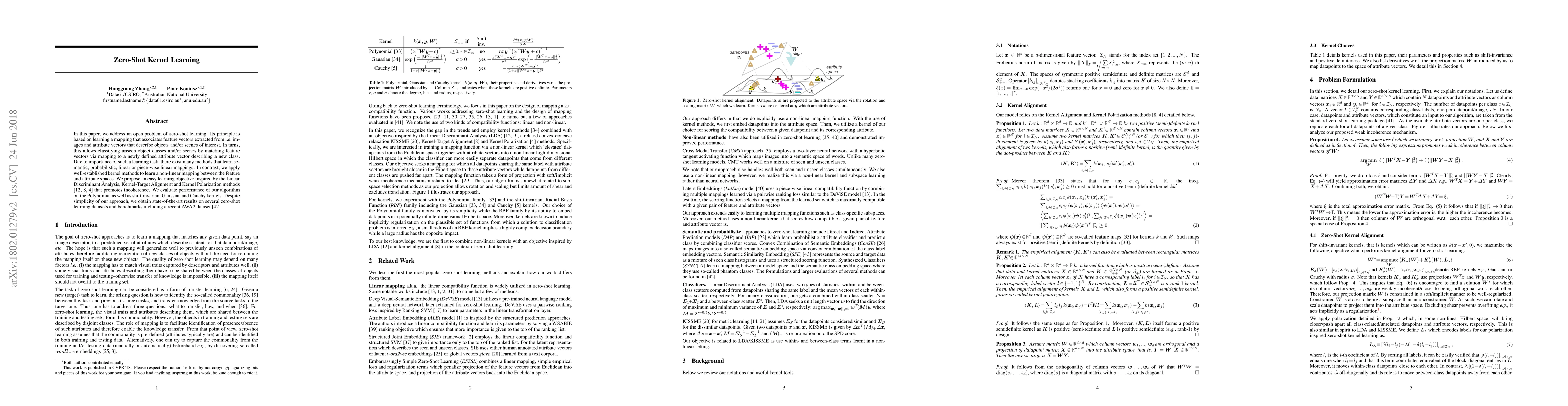 In this paper, we address an open problem of zero-shot learning. Its principle is based on learning a mapping that associates feature vectors extracted from i.e. images and attribute vectors that describe objects and/or scenes of interest. In turns, this allows classifying unseen object classes and/or scenes by matching feature vectors via mapping to a newly defined attribute vector describing a new class. Due to importance of such a learning task, there exist many methods that learn semantic, probabilistic, linear or piece-wise linear mappings. In contrast, we apply well-established kernel methods to learn a non-linear mapping between the feature and attribute spaces. We propose an easy learning objective inspired by the Linear Discriminant Analysis, Kernel-Target Alignment and Kernel Polarization methods that promotes incoherence. We evaluate performance of our algorithm on the Polynomial as well as shift-invariant Gaussian and Cauchy kernels. Despite simplicity of our approach, we obtain state-of-the-art results on several zero-shot learning datasets and benchmarks including a recent AWA2 dataset.