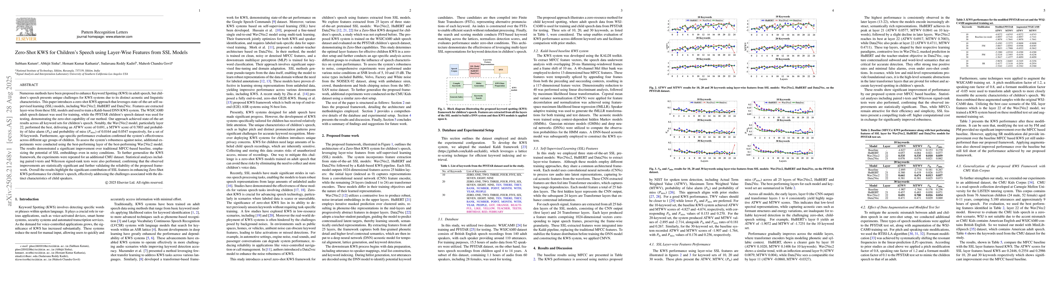 Numerous methods have been proposed to enhance Keyword Spotting (KWS) in adult speech, but children's speech presents unique challenges for KWS systems due to its distinct acoustic and linguistic characteristics. This paper introduces a zero-shot KWS approach that leverages state-of-the-art self-supervised learning (SSL) models, including Wav2Vec2, HuBERT and Data2Vec. Features are extracted layer-wise from these SSL models and used to train a Kaldi-based DNN KWS system. The WSJCAM0 adult speech dataset was used for training, while the PFSTAR children's speech dataset was used for testing, demonstrating the zero-shot capability of our method. Our approach achieved state-of-the-art results across all keyword sets for children's speech. Notably, the Wav2Vec2 model, particularly layer 22, performed the best, delivering an ATWV score of 0.691, a MTWV score of 0.7003 and probability of false alarm and probability of miss of 0.0164 and 0.0547 respectively, for a set of 30 keywords. Furthermore, age-specific performance evaluation confirmed the system's effectiveness across different age groups of children. To assess the system's robustness against noise, additional experiments were conducted using the best-performing layer of the best-performing Wav2Vec2 model. The results demonstrated a significant improvement over traditional MFCC-based baseline, emphasizing the potential of SSL embeddings even in noisy conditions. To further generalize the KWS framework, the experiments were repeated for an additional CMU dataset. Overall the results highlight the significant contribution of SSL features in enhancing Zero-Shot KWS performance for children's speech, effectively addressing the challenges associated with the distinct characteristics of child speakers.