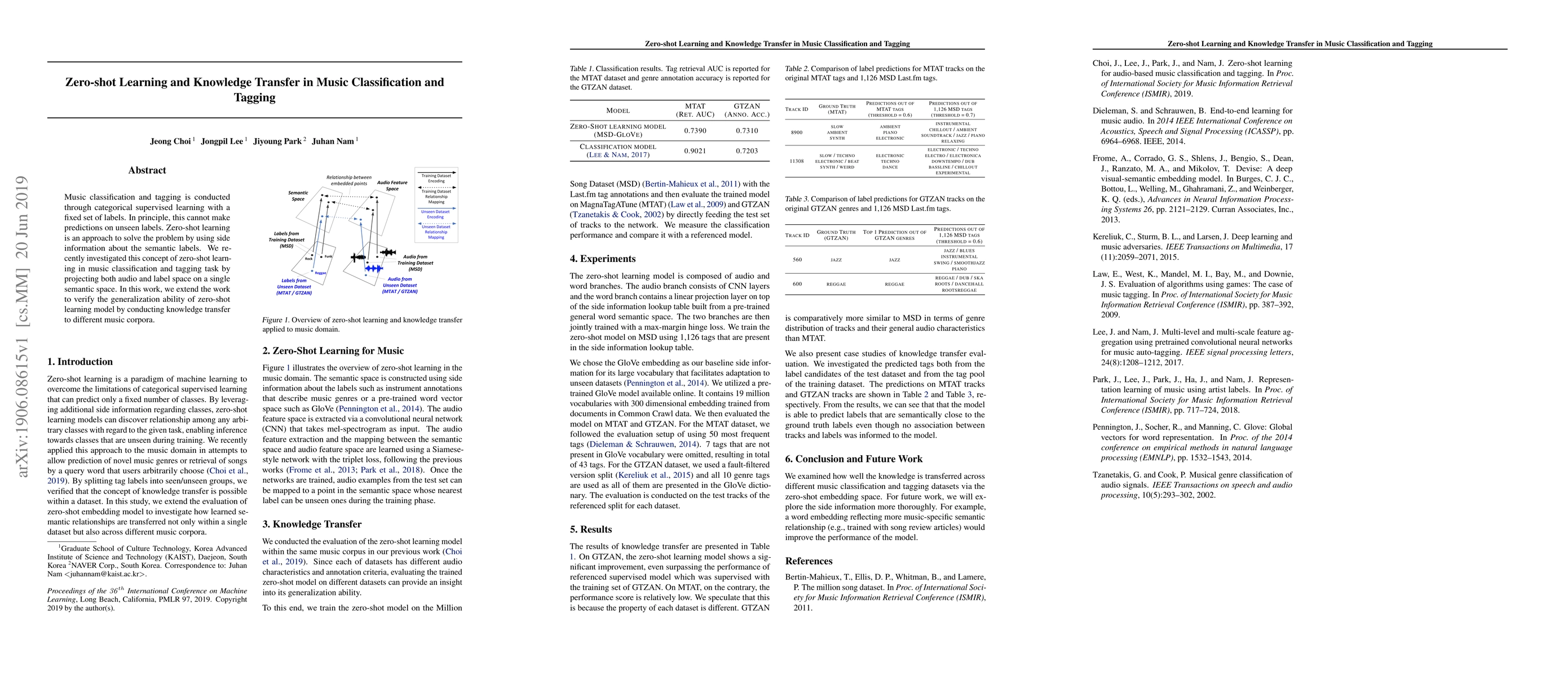 This paper explores zero-shot learning for music classification and tagging, projecting audio and label spaces into a shared semantic space to handle unseen labels. It extends previous work by testing the model's generalization through knowledge transfer across different music corpora.