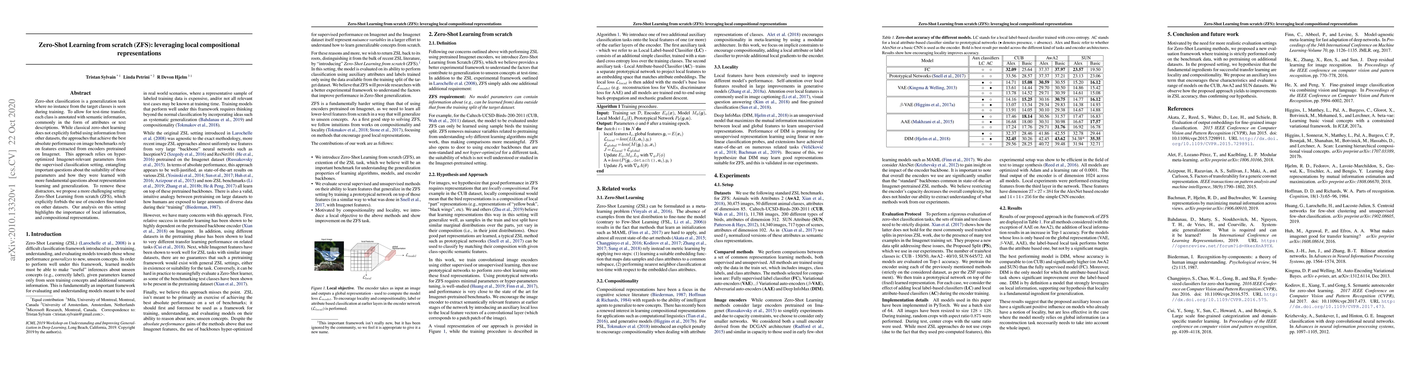 Zero-shot classification is a generalization task where no instance from the target classes is seen during training. To allow for test-time transfer, each class is annotated with semantic information, commonly in the form of attributes or text descriptions. While classical zero-shot learning does not explicitly forbid using information from other datasets, the approaches that achieve the best absolute performance on image benchmarks rely on features extracted from encoders pretrained on Imagenet. This approach relies on hyper-optimized Imagenet-relevant parameters from the supervised classification setting, entangling important questions about the suitability of those parameters and how they were learned with more fundamental questions about representation learning and generalization. To remove these distractors, we propose a more challenging setting: Zero-Shot Learning from scratch (ZFS), which explicitly forbids the use of encoders fine-tuned on other datasets. Our analysis on this setting highlights the importance of local information, and compositional representations.