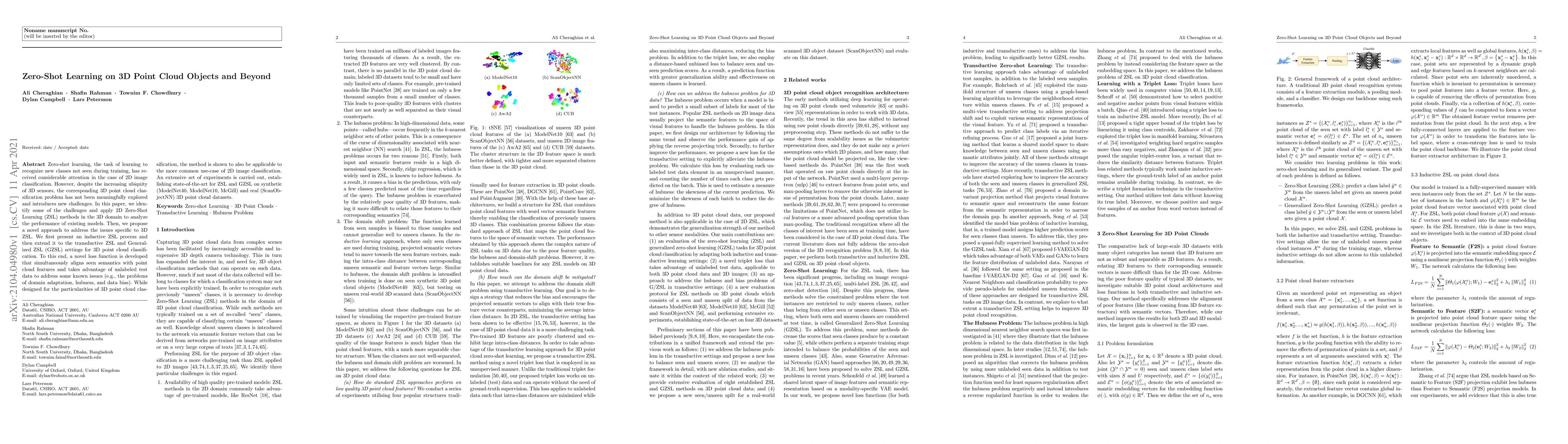 This paper explores zero-shot learning for 3D point cloud classification, identifying challenges and adapting 2D methods. It proposes a novel loss function to address domain adaptation, hubness, and data bias, achieving state-of-the-art results on both synthetic and real 3D datasets and demonstrating applicability to 2D image classification.