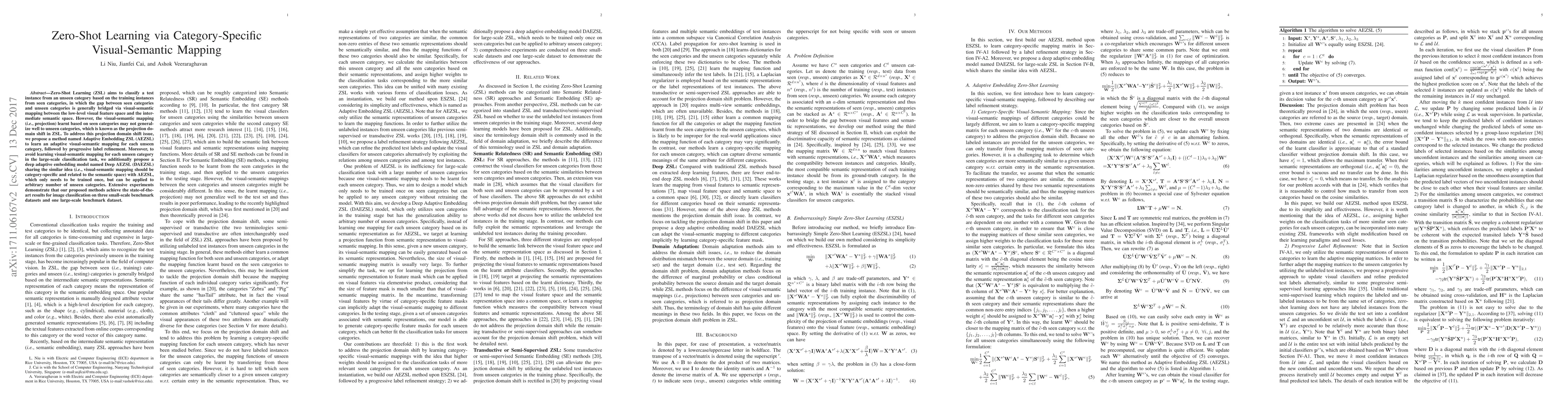 The paper proposes Adaptive Embedding Zero-Shot Learning (AEZSL) to bridge the domain shift issue in zero-shot learning by learning category-specific visual-semantic mappings. It further extends AEZSL to a semi-supervised approach and a deep adaptive embedding model, achieving state-of-the-art results on benchmark datasets.