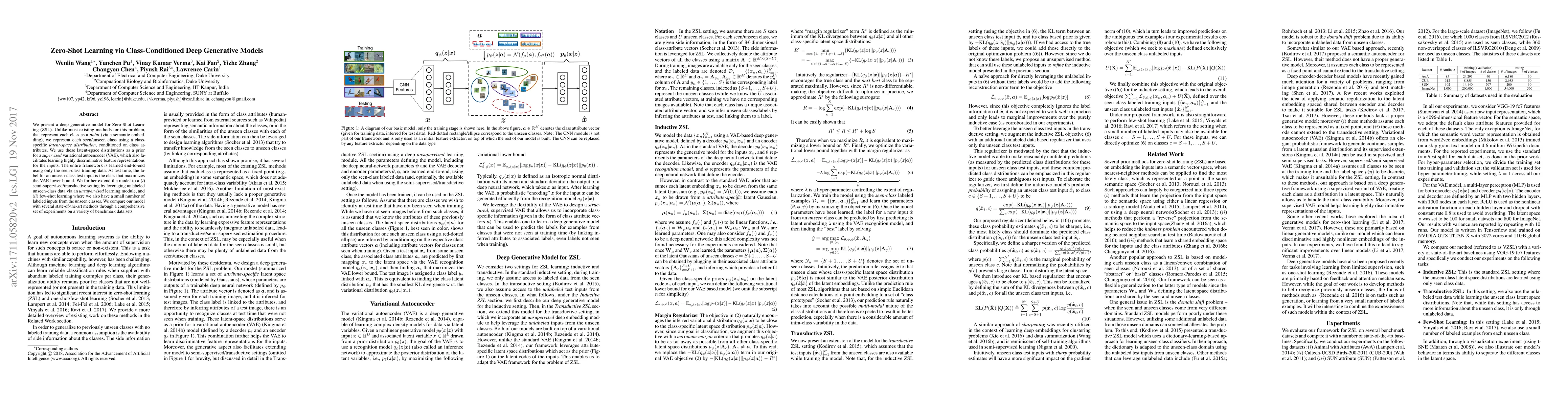 We present a deep generative model for learning to predict classes not seen at training time. Unlike most existing methods for this problem, that represent each class as a point (via a semantic embedding), we represent each seen/unseen class using a class-specific latent-space distribution, conditioned on class attributes. We use these latent-space distributions as a prior for a supervised variational autoencoder (VAE), which also facilitates learning highly discriminative feature representations for the inputs. The entire framework is learned end-to-end using only the seen-class training data. The model infers corresponding attributes of a test image by maximizing the VAE lower bound; the inferred attributes may be linked to labels not seen when training. We further extend our model to a (1) semi-supervised/transductive setting by leveraging unlabeled unseen-class data via an unsupervised learning module, and (2) few-shot learning where we also have a small number of labeled inputs from the unseen classes. We compare our model with several state-of-the-art methods through a comprehensive set of experiments on a variety of benchmark data sets.