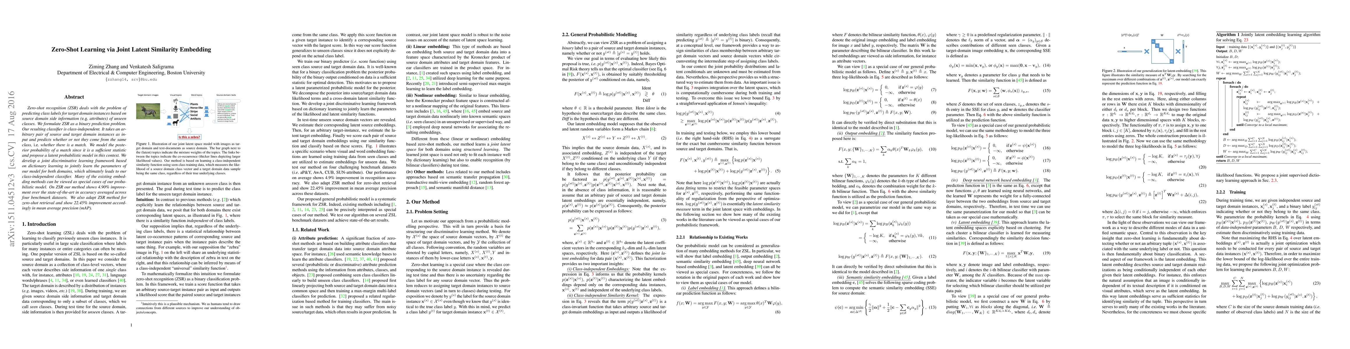 Zero-shot recognition (ZSR) deals with the problem of predicting class labels for target domain instances based on source domain side information (e.g. attributes) of unseen classes. We formulate ZSR as a binary prediction problem. Our resulting classifier is class-independent. It takes an arbitrary pair of source and target domain instances as input and predicts whether or not they come from the same class, i.e. whether there is a match. We model the posterior probability of a match since it is a sufficient statistic and propose a latent probabilistic model in this context. We develop a joint discriminative learning framework based on dictionary learning to jointly learn the parameters of our model for both domains, which ultimately leads to our class-independent classifier. Many of the existing embedding methods can be viewed as special cases of our probabilistic model. On ZSR our method shows 4.90\% improvement over the state-of-the-art in accuracy averaged across four benchmark datasets. We also adapt ZSR method for zero-shot retrieval and show 22.45\% improvement accordingly in mean average precision (mAP).