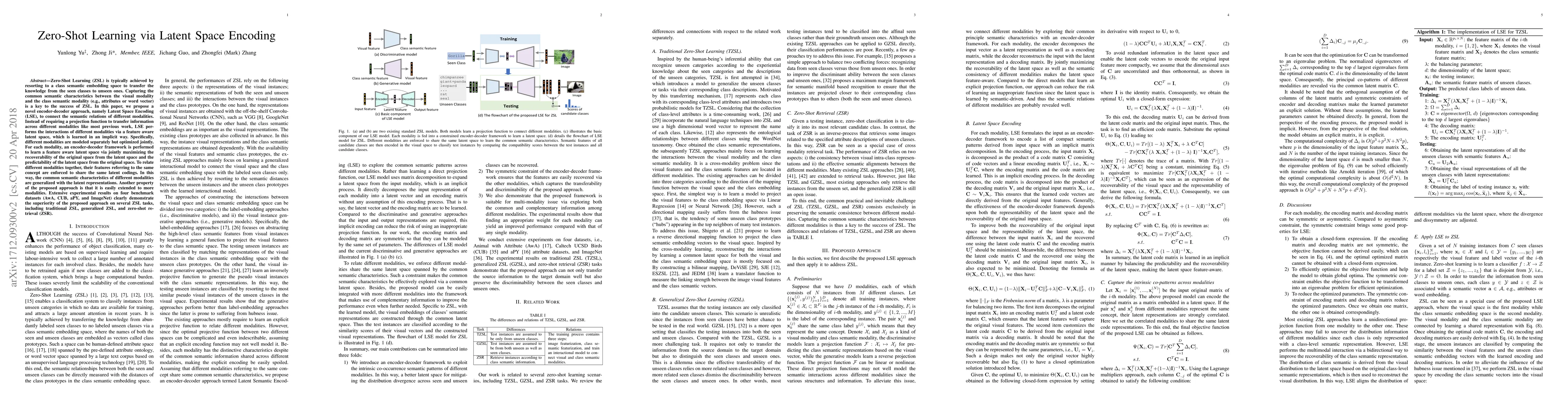 This paper proposes Latent Space Encoding (LSE), an encoder-decoder approach for Zero-Shot Learning that connects visual and semantic modalities through a feature-aware latent space, achieving better generalization of common semantic characteristics without requiring projection functions. Experimental results show superior performance across multiple ZSL tasks on benchmark datasets.