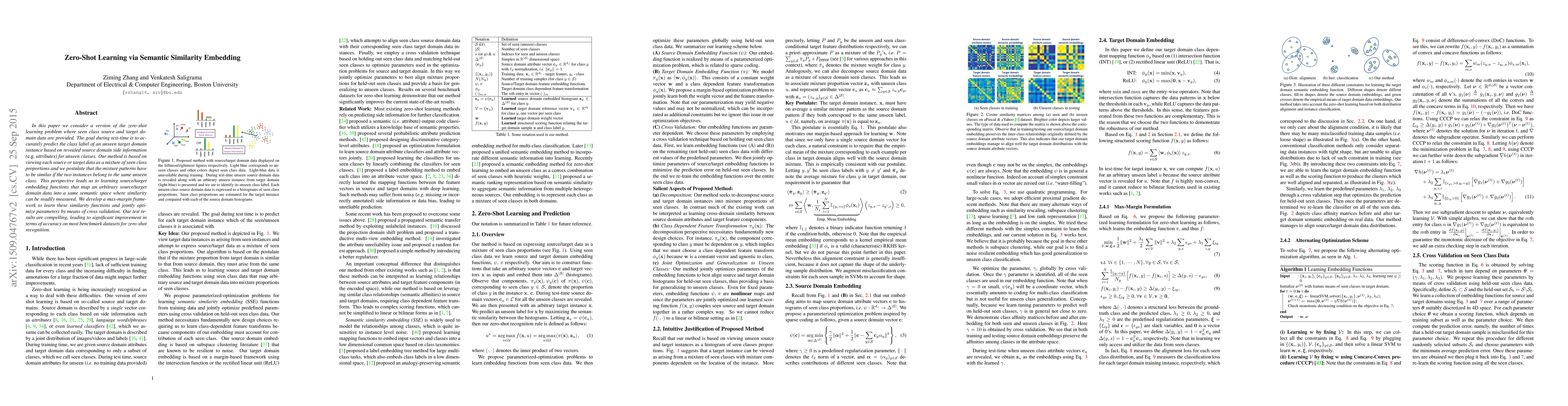 In this paper we consider a version of the zero-shot learning problem where seen class source and target domain data are provided. The goal during test-time is to accurately predict the class label of an unseen target domain instance based on revealed source domain side information (\eg attributes) for unseen classes. Our method is based on viewing each source or target data as a mixture of seen class proportions and we postulate that the mixture patterns have to be similar if the two instances belong to the same unseen class. This perspective leads us to learning source/target embedding functions that map an arbitrary source/target domain data into a same semantic space where similarity can be readily measured. We develop a max-margin framework to learn these similarity functions and jointly optimize parameters by means of cross validation. Our test results are compelling, leading to significant improvement in terms of accuracy on most benchmark datasets for zero-shot recognition.