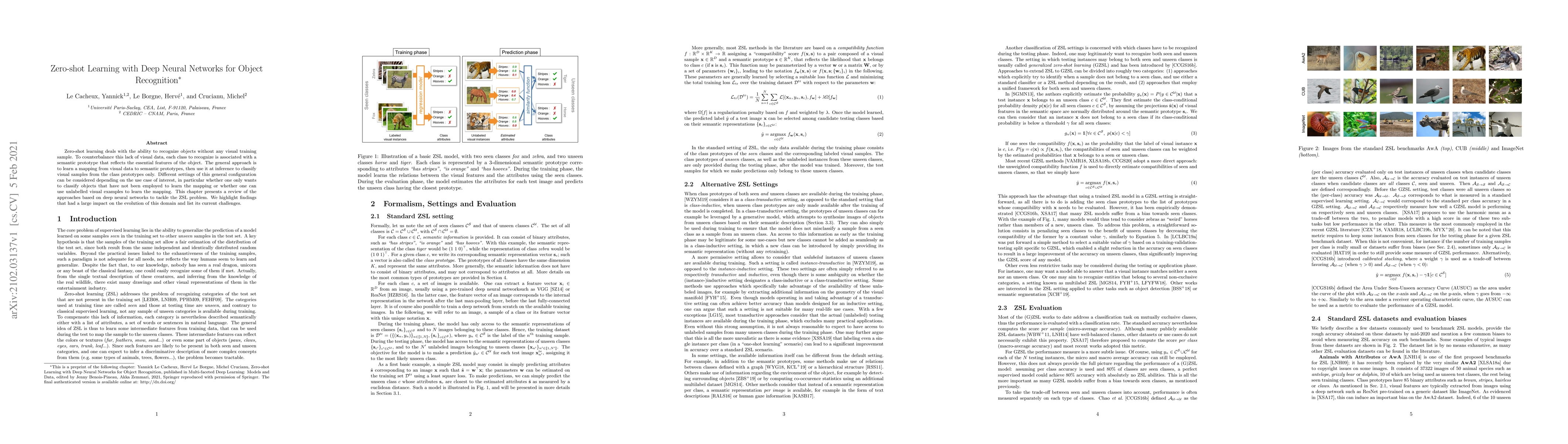 Zero-shot learning deals with the ability to recognize objects without any visual training sample. To counterbalance this lack of visual data, each class to recognize is associated with a semantic prototype that reflects the essential features of the object. The general approach is to learn a mapping from visual data to semantic prototypes, then use it at inference to classify visual samples from the class prototypes only. Different settings of this general configuration can be considered depending on the use case of interest, in particular whether one only wants to classify objects that have not been employed to learn the mapping or whether one can use unlabelled visual examples to learn the mapping. This chapter presents a review of the approaches based on deep neural networks to tackle the ZSL problem. We highlight findings that had a large impact on the evolution of this domain and list its current challenges.