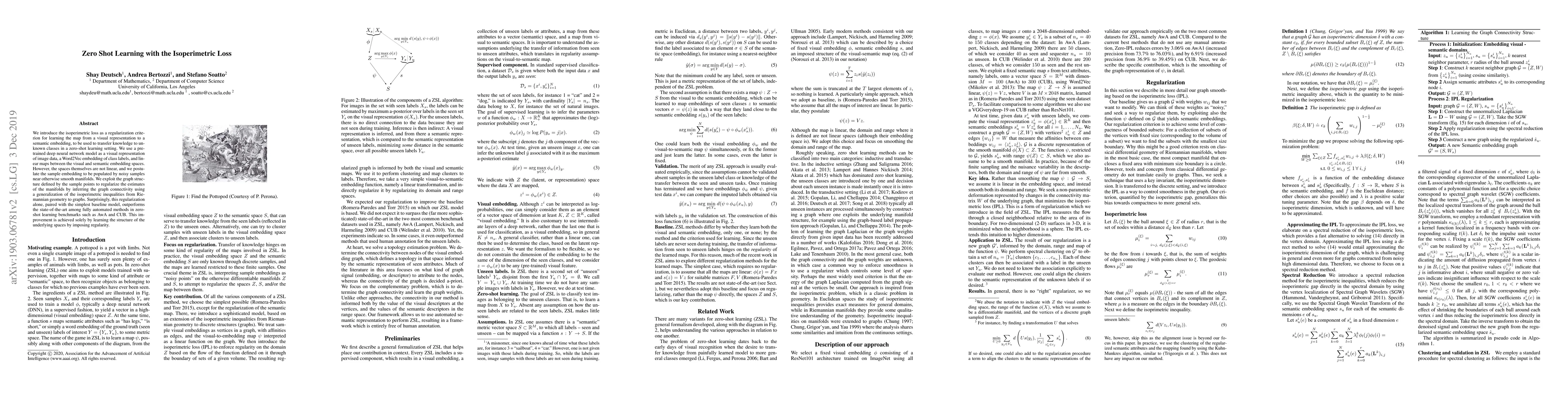 We introduce the isoperimetric loss as a regularization criterion for learning the map from a visual representation to a semantic embedding, to be used to transfer knowledge to unknown classes in a zero-shot learning setting. We use a pre-trained deep neural network model as a visual representation of image data, a Word2Vec embedding of class labels, and linear maps between the visual and semantic embedding spaces. However, the spaces themselves are not linear, and we postulate the sample embedding to be populated by noisy samples near otherwise smooth manifolds. We exploit the graph structure defined by the sample points to regularize the estimates of the manifolds by inferring the graph connectivity using a generalization of the isoperimetric inequalities from Riemannian geometry to graphs. Surprisingly, this regularization alone, paired with the simplest baseline model, outperforms the state-of-the-art among fully automated methods in zero-shot learning benchmarks such as AwA and CUB. This improvement is achieved solely by learning the structure of the underlying spaces by imposing regularity.