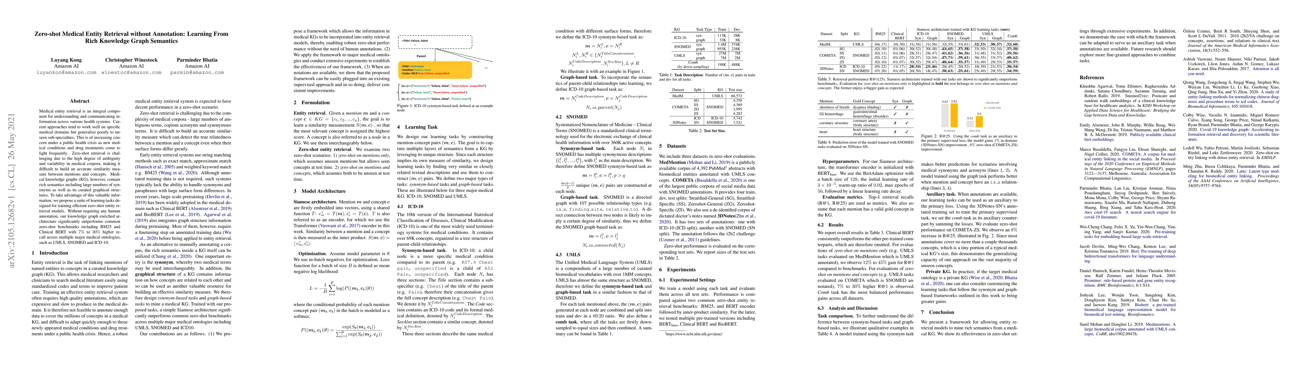 This paper proposes a zero-shot medical entity retrieval method leveraging rich knowledge graph semantics to improve performance without requiring human annotations. The approach significantly outperforms existing benchmarks, achieving 7% to 30% higher recall across major medical ontologies.