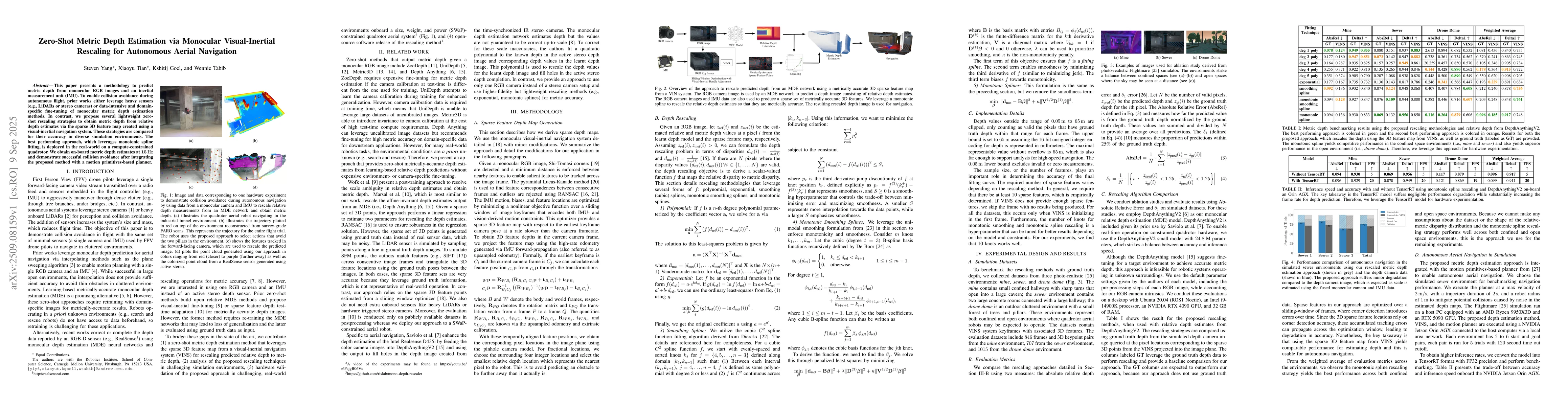 This paper presents a methodology to predict metric depth from monocular RGB images and an inertial measurement unit (IMU). To enable collision avoidance during autonomous flight, prior works either leverage heavy sensors (e.g., LiDARs or stereo cameras) or data-intensive and domain-specific fine-tuning of monocular metric depth estimation methods. In contrast, we propose several lightweight zero-shot rescaling strategies to obtain metric depth from relative depth estimates via the sparse 3D feature map created using a visual-inertial navigation system. These strategies are compared for their accuracy in diverse simulation environments. The best performing approach, which leverages monotonic spline fitting, is deployed in the real-world on a compute-constrained quadrotor. We obtain on-board metric depth estimates at 15 Hz and demonstrate successful collision avoidance after integrating the proposed method with a motion primitives-based planner.