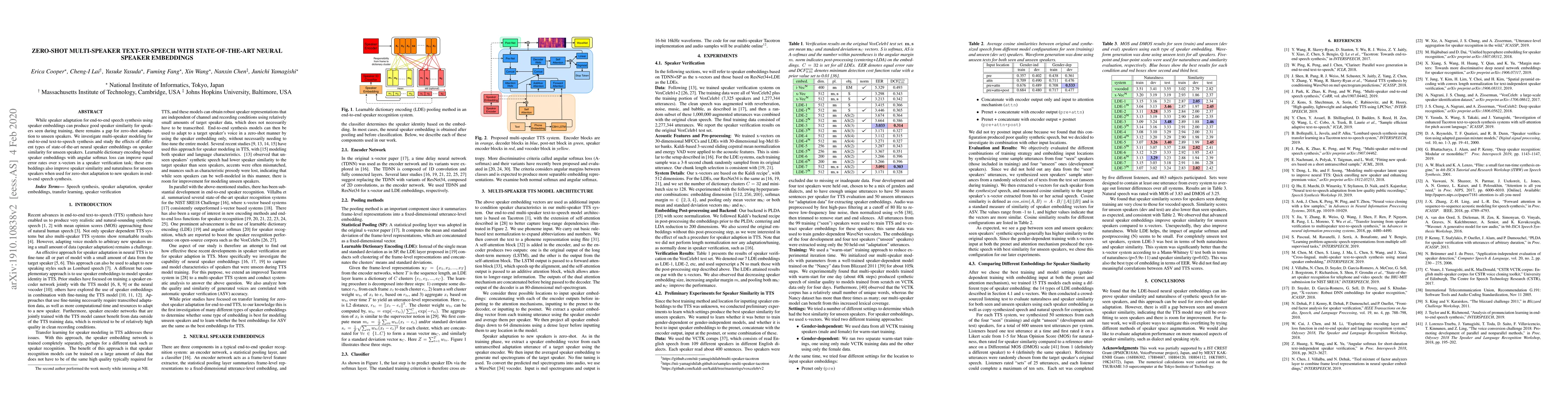 This paper explores multi-speaker text-to-speech synthesis using state-of-the-art neural speaker embeddings for zero-shot adaptation to unseen speakers. Learnable dictionary encoding-based embeddings with angular softmax loss show improved performance over x-vectors in speaker similarity and naturalness for new speakers.