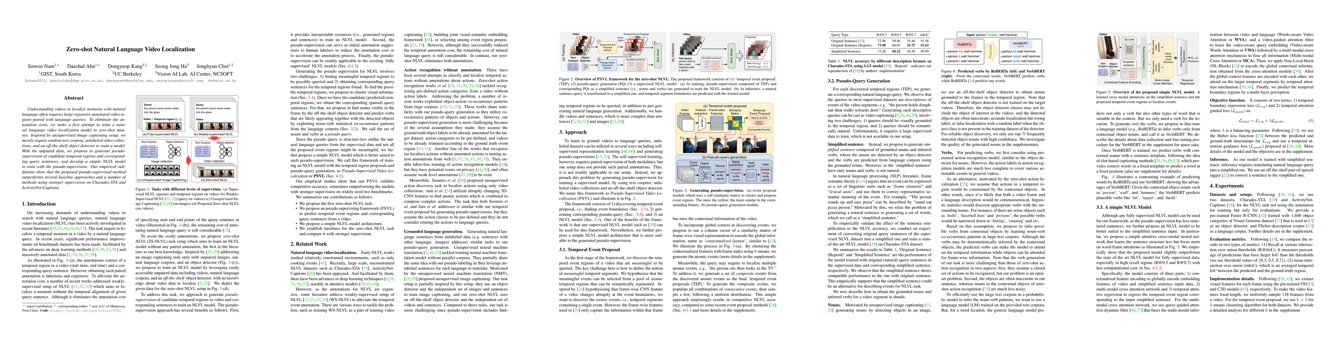 Understanding videos to localize moments with natural language often requires large expensive annotated video regions paired with language queries. To eliminate the annotation costs, we make a first attempt to train a natural language video localization model in zero-shot manner. Inspired by unsupervised image captioning setup, we merely require random text corpora, unlabeled video collections, and an off-the-shelf object detector to train a model. With the unpaired data, we propose to generate pseudo-supervision of candidate temporal regions and corresponding query sentences, and develop a simple NLVL model to train with the pseudo-supervision. Our empirical validations show that the proposed pseudo-supervised method outperforms several baseline approaches and a number of methods using stronger supervision on Charades-STA and ActivityNet-Captions.