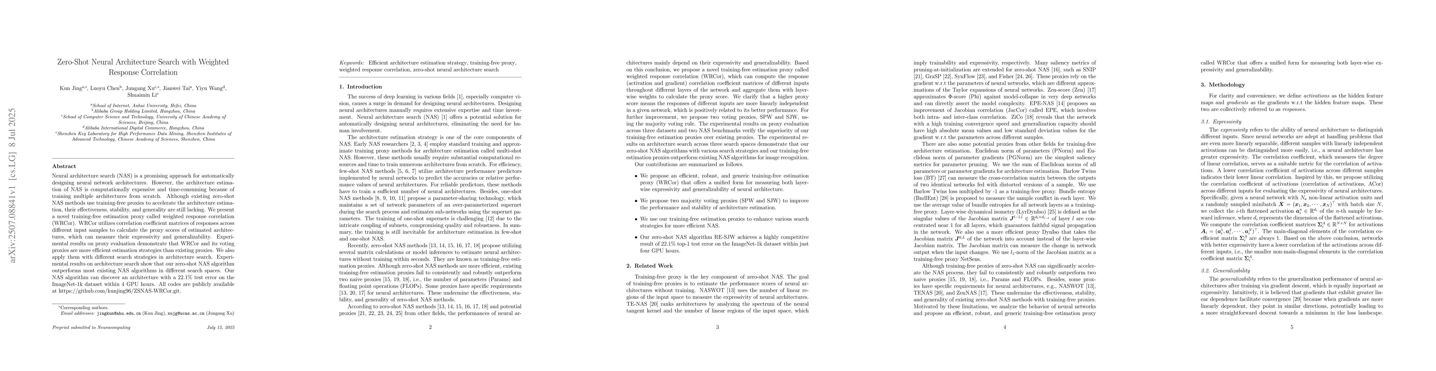 Neural architecture search (NAS) is a promising approach for automatically designing neural network architectures. However, the architecture estimation of NAS is computationally expensive and time-consuming because of training multiple architectures from scratch. Although existing zero-shot NAS methods use training-free proxies to accelerate the architecture estimation, their effectiveness, stability, and generality are still lacking. We present a novel training-free estimation proxy called weighted response correlation (WRCor). WRCor utilizes correlation coefficient matrices of responses across different input samples to calculate the proxy scores of estimated architectures, which can measure their expressivity and generalizability. Experimental results on proxy evaluation demonstrate that WRCor and its voting proxies are more efficient estimation strategies than existing proxies. We also apply them with different search strategies in architecture search. Experimental results on architecture search show that our zero-shot NAS algorithm outperforms most existing NAS algorithms in different search spaces. Our NAS algorithm can discover an architecture with a 22.1% test error on the ImageNet-1k dataset within 4 GPU hours. All codes are publicly available at https://github.com/kunjing96/ZSNAS-WRCor.git.