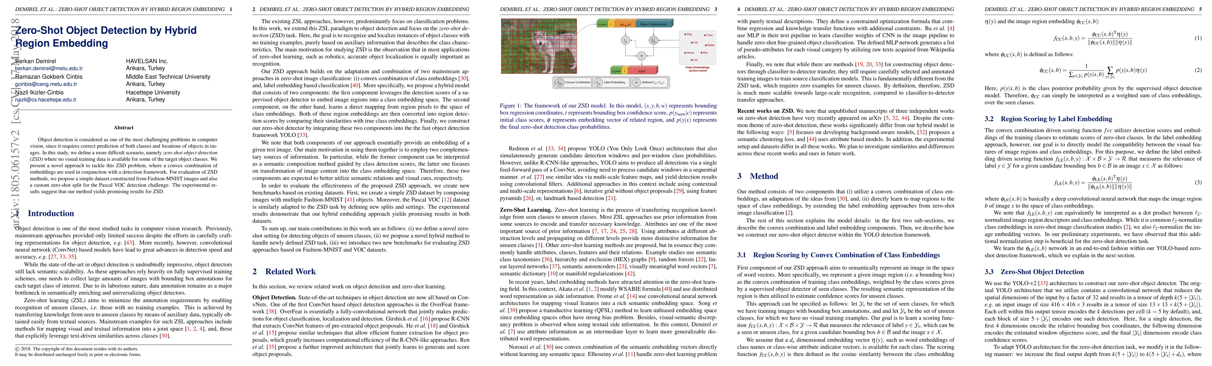 This paper introduces a novel method for zero-shot object detection using hybrid region embeddings and a detection framework, demonstrating promising results on custom datasets derived from Fashion-MNIST and Pascal VOC. The approach tackles the challenge of detecting object classes without prior visual training data.