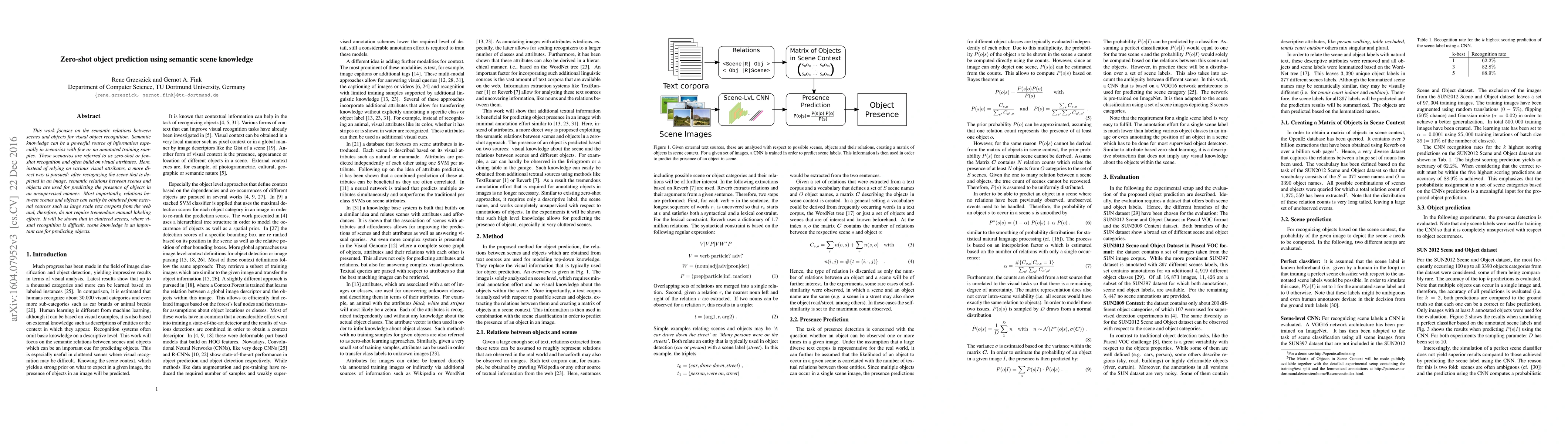 This work focuses on the semantic relations between scenes and objects for visual object recognition. Semantic knowledge can be a powerful source of information especially in scenarios with few or no annotated training samples. These scenarios are referred to as zero-shot or few-shot recognition and often build on visual attributes. Here, instead of relying on various visual attributes, a more direct way is pursued: after recognizing the scene that is depicted in an image, semantic relations between scenes and objects are used for predicting the presence of objects in an unsupervised manner. Most importantly, relations between scenes and objects can easily be obtained from external sources such as large scale text corpora from the web and, therefore, do not require tremendous manual labeling efforts. It will be shown that in cluttered scenes, where visual recognition is difficult, scene knowledge is an important cue for predicting objects.