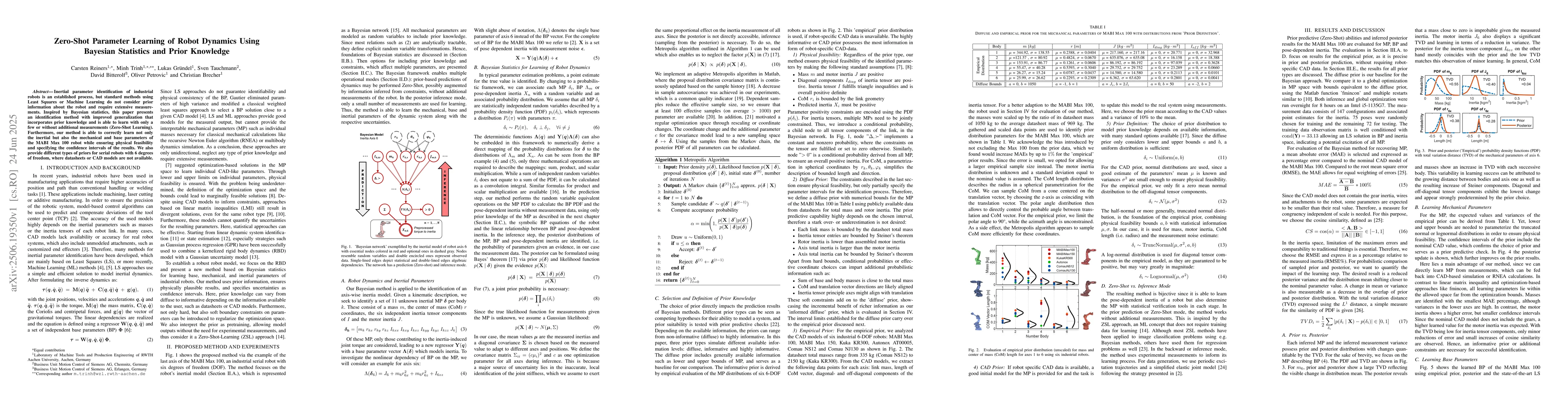 Inertial parameter identification of industrial robots is an established process, but standard methods using Least Squares or Machine Learning do not consider prior information about the robot and require extensive measurements. Inspired by Bayesian statistics, this paper presents an identification method with improved generalization that incorporates prior knowledge and is able to learn with only a few or without additional measurements (Zero-Shot Learning). Furthermore, our method is able to correctly learn not only the inertial but also the mechanical and base parameters of the MABI Max 100 robot while ensuring physical feasibility and specifying the confidence intervals of the results. We also provide different types of priors for serial robots with 6 degrees of freedom, where datasheets or CAD models are not available.