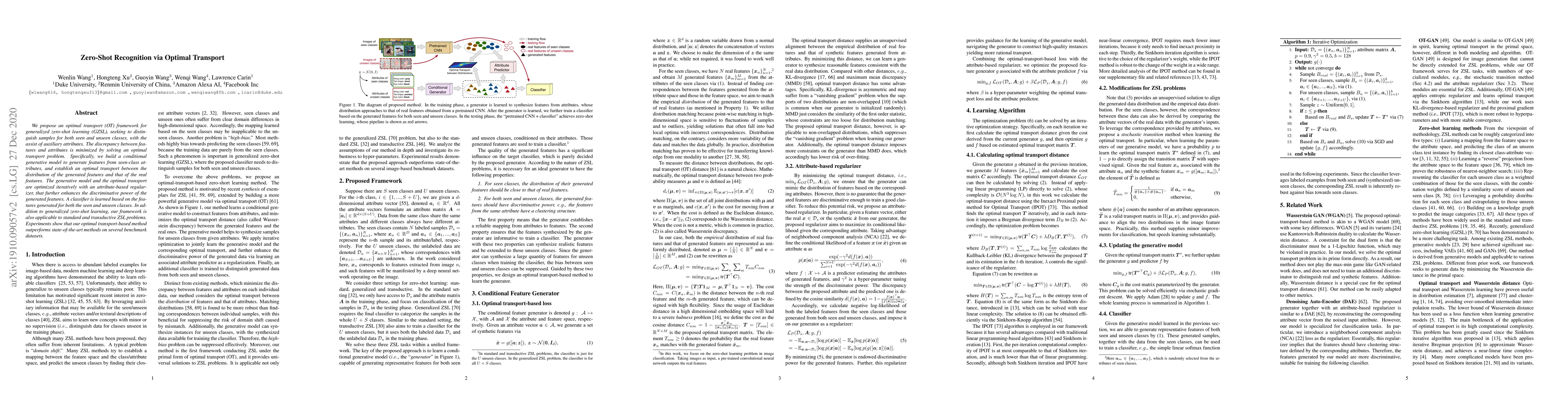 This paper proposes an optimal transport framework for generalized zero-shot learning, generating features from seen-class attributes and minimizing the discrepancy between these features and real features using an optimal transport problem. The method outperforms state-of-the-art on benchmark datasets.