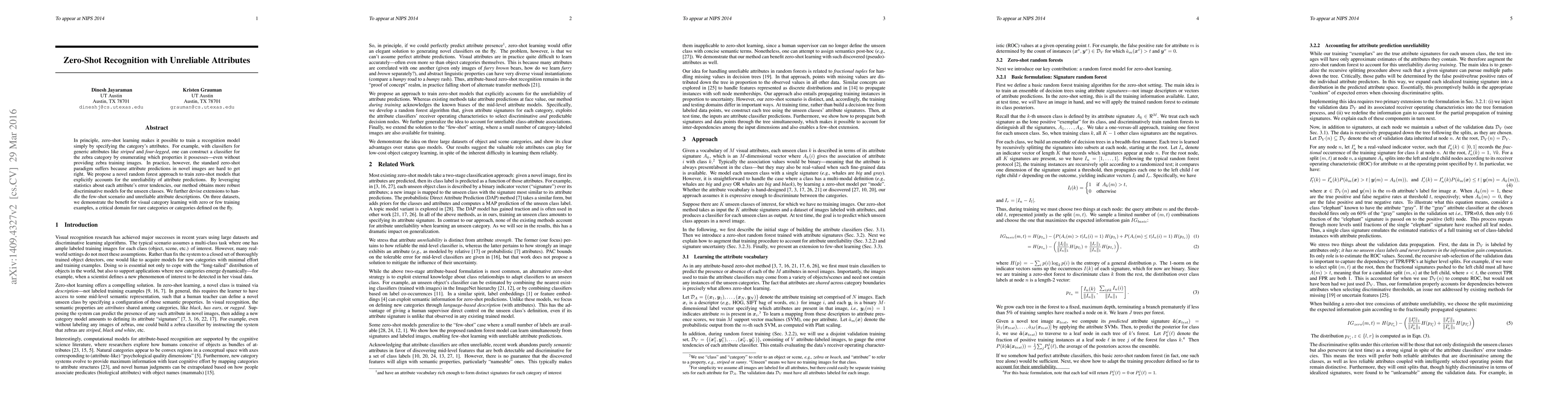 In principle, zero-shot learning makes it possible to train a recognition model simply by specifying the category's attributes. For example, with classifiers for generic attributes like \emph{striped} and \emph{four-legged}, one can construct a classifier for the zebra category by enumerating which properties it possesses---even without providing zebra training images. In practice, however, the standard zero-shot paradigm suffers because attribute predictions in novel images are hard to get right. We propose a novel random forest approach to train zero-shot models that explicitly accounts for the unreliability of attribute predictions. By leveraging statistics about each attribute's error tendencies, our method obtains more robust discriminative models for the unseen classes. We further devise extensions to handle the few-shot scenario and unreliable attribute descriptions. On three datasets, we demonstrate the benefit for visual category learning with zero or few training examples, a critical domain for rare categories or categories defined on the fly.