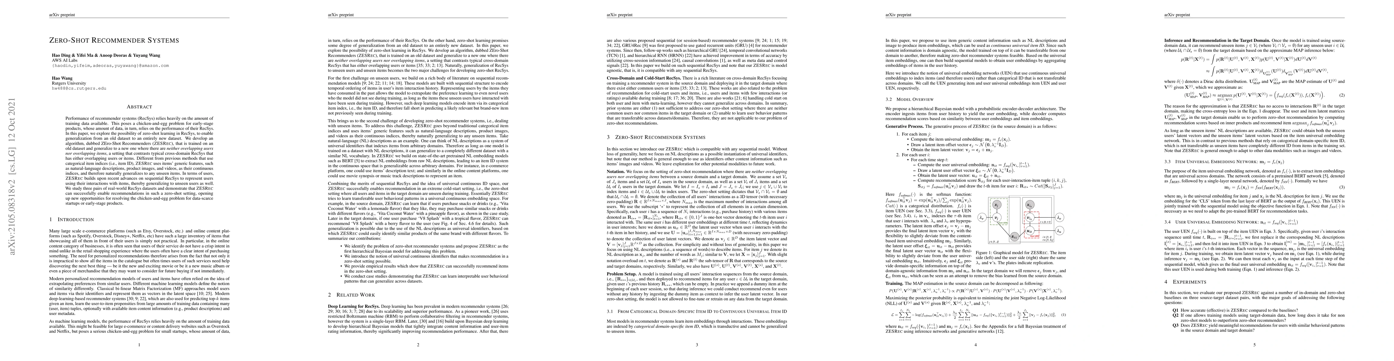 Performance of recommender systems (RS) relies heavily on the amount of training data available. This poses a chicken-and-egg problem for early-stage products, whose amount of data, in turn, relies on the performance of their RS. On the other hand, zero-shot learning promises some degree of generalization from an old dataset to an entirely new dataset. In this paper, we explore the possibility of zero-shot learning in RS. We develop an algorithm, dubbed ZEro-Shot Recommenders (ZESRec), that is trained on an old dataset and generalize to a new one where there are neither overlapping users nor overlapping items, a setting that contrasts typical cross-domain RS that has either overlapping users or items. Different from categorical item indices, i.e., item ID, in previous methods, ZESRec uses items' natural-language descriptions (or description embeddings) as their continuous indices, and therefore naturally generalize to any unseen items. In terms of users, ZESRec builds upon recent advances on sequential RS to represent users using their interactions with items, thereby generalizing to unseen users as well. We study three pairs of real-world RS datasets and demonstrate that ZESRec can successfully enable recommendations in such a zero-shot setting, opening up new opportunities for resolving the chicken-and-egg problem for data-scarce startups or early-stage products.