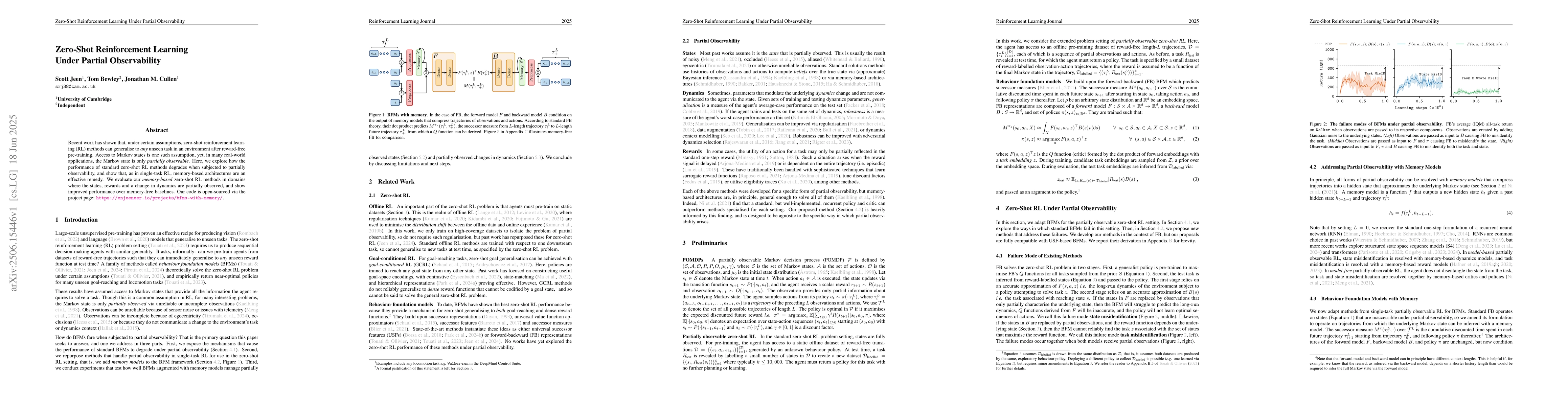 Recent work has shown that, under certain assumptions, zero-shot reinforcement learning (RL) methods can generalise to any unseen task in an environment after reward-free pre-training. Access to Markov states is one such assumption, yet, in many real-world applications, the Markov state is only partially observable. Here, we explore how the performance of standard zero-shot RL methods degrades when subjected to partially observability, and show that, as in single-task RL, memory-based architectures are an effective remedy. We evaluate our memory-based zero-shot RL methods in domains where the states, rewards and a change in dynamics are partially observed, and show improved performance over memory-free baselines. Our code is open-sourced via: https://enjeeneer.io/projects/bfms-with-memory/.