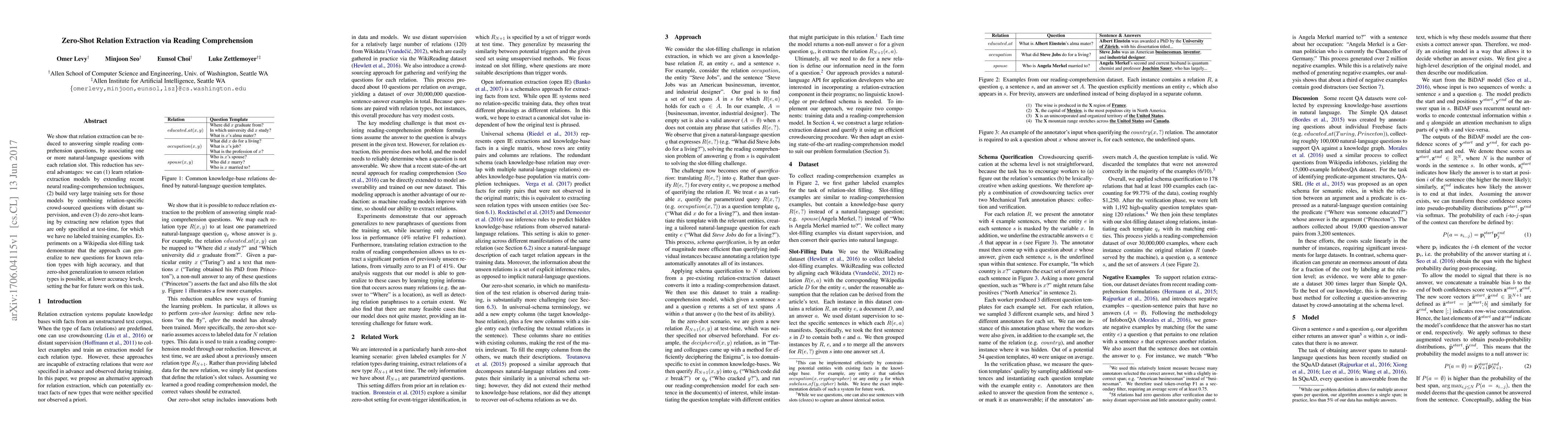This paper proposes a method for zero-shot relation extraction by framing it as a reading comprehension task, leveraging neural techniques to answer relation-specific questions. The approach demonstrates high accuracy for known relation types and initial success in zero-shot learning for new, unseen relation types.