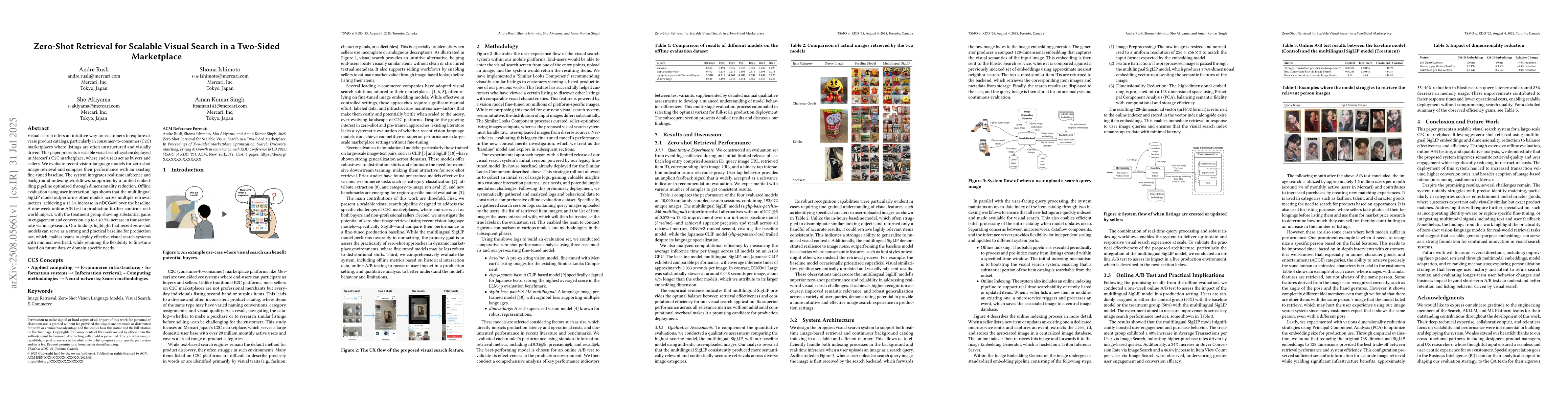 Visual search offers an intuitive way for customers to explore diverse product catalogs, particularly in consumer-to-consumer (C2C) marketplaces where listings are often unstructured and visually driven. This paper presents a scalable visual search system deployed in Mercari's C2C marketplace, where end-users act as buyers and sellers. We evaluate recent vision-language models for zero-shot image retrieval and compare their performance with an existing fine-tuned baseline. The system integrates real-time inference and background indexing workflows, supported by a unified embedding pipeline optimized through dimensionality reduction. Offline evaluation using user interaction logs shows that the multilingual SigLIP model outperforms other models across multiple retrieval metrics, achieving a 13.3% increase in nDCG@5 over the baseline. A one-week online A/B test in production further confirms real-world impact, with the treatment group showing substantial gains in engagement and conversion, up to a 40.9% increase in transaction rate via image search. Our findings highlight that recent zero-shot models can serve as a strong and practical baseline for production use, which enables teams to deploy effective visual search systems with minimal overhead, while retaining the flexibility to fine-tune based on future data or domain-specific needs.