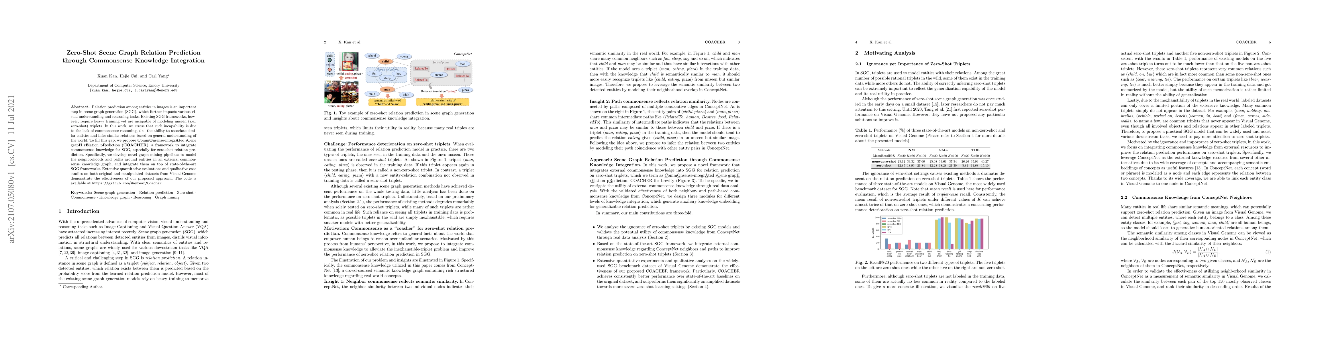 This paper proposes COACHER, a framework that integrates commonsense knowledge to enable zero-shot scene graph relation prediction. It uses graph mining to model entity neighborhoods and paths in a commonsense knowledge graph, enhancing existing scene graph generation frameworks for unseen triplets.