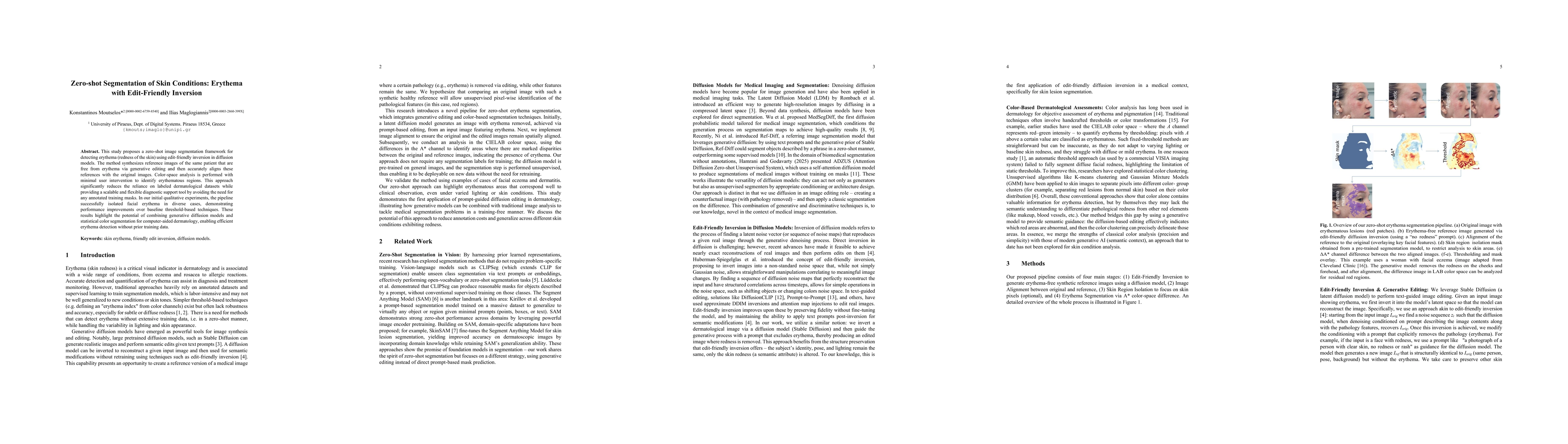 This study proposes a zero-shot image segmentation framework for detecting erythema (redness of the skin) using edit-friendly inversion in diffusion models. The method synthesizes reference images of the same patient that are free from erythema via generative editing and then accurately aligns these references with the original images. Color-space analysis is performed with minimal user intervention to identify erythematous regions. This approach significantly reduces the reliance on labeled dermatological datasets while providing a scalable and flexible diagnostic support tool by avoiding the need for any annotated training masks. In our initial qualitative experiments, the pipeline successfully isolated facial erythema in diverse cases, demonstrating performance improvements over baseline threshold-based techniques. These results highlight the potential of combining generative diffusion models and statistical color segmentation for computer-aided dermatology, enabling efficient erythema detection without prior training data.