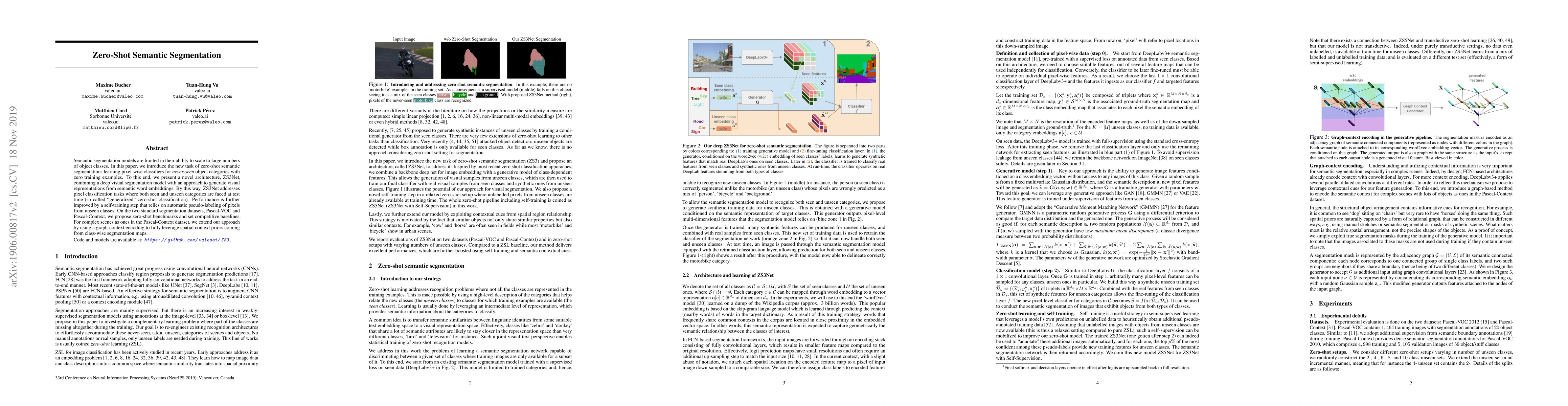 This paper introduces zero-shot semantic segmentation, enabling pixel-wise classification for unseen object categories without prior training examples. The proposed ZS3Net architecture combines deep segmentation models with semantic word embeddings, enhanced by self-training and graph-context encoding for complex scenes.