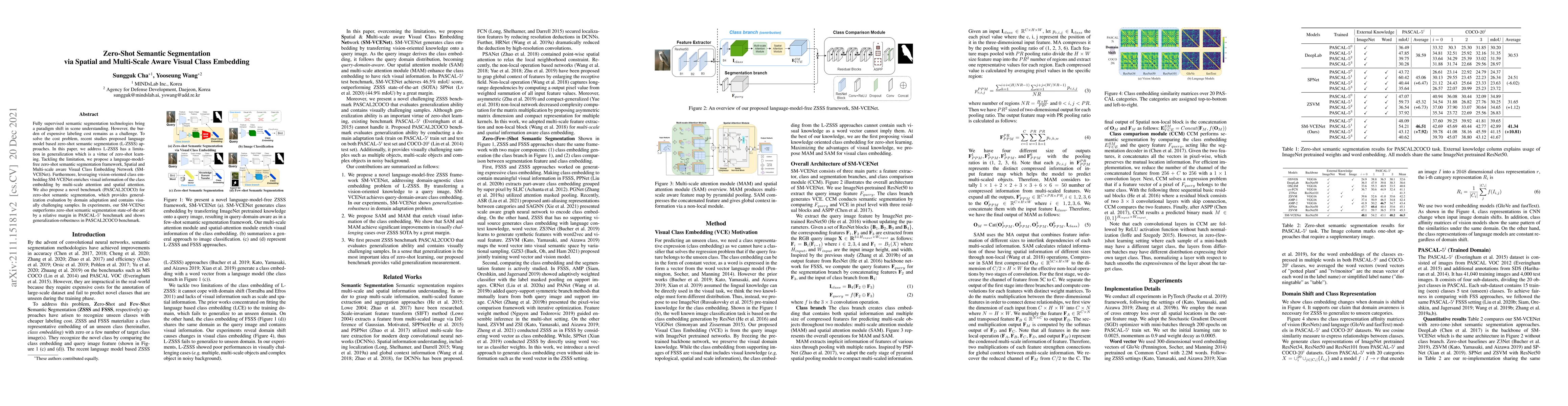 This paper proposes SM-VCENet, a language-model-free framework for zero-shot semantic segmentation that enhances class embedding through multi-scale and spatial attention, addressing generalization limitations. It introduces a new benchmark, PASCAL2COCO, for evaluating zero-shot segmentation, demonstrating superior performance over existing methods.