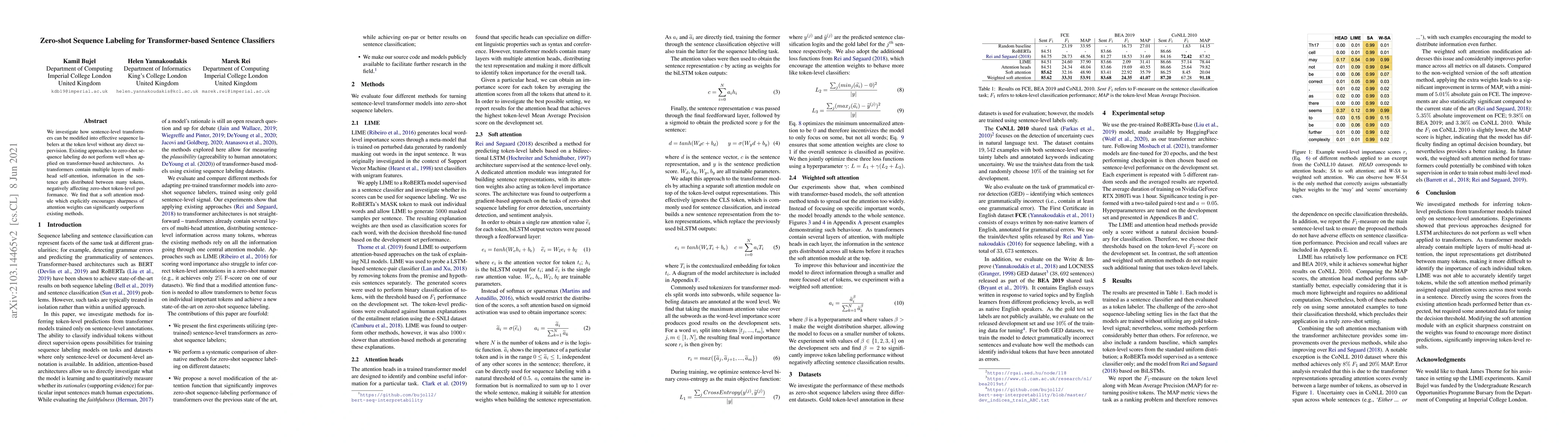 This paper explores modifying transformer-based sentence classifiers to perform zero-shot sequence labeling at the token level without direct supervision. The proposed soft attention module enhances performance by improving the sharpness of attention weights, outperforming existing methods.