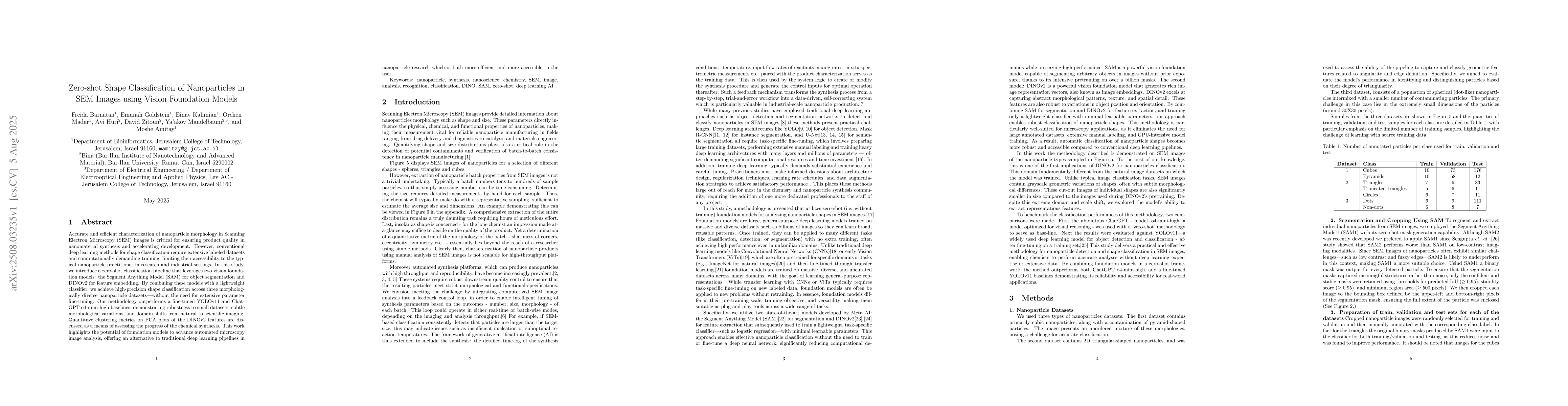 Accurate and efficient characterization of nanoparticle morphology in Scanning Electron Microscopy (SEM) images is critical for ensuring product quality in nanomaterial synthesis and accelerating development. However, conventional deep learning methods for shape classification require extensive labeled datasets and computationally demanding training, limiting their accessibility to the typical nanoparticle practitioner in research and industrial settings. In this study, we introduce a zero-shot classification pipeline that leverages two vision foundation models: the Segment Anything Model (SAM) for object segmentation and DINOv2 for feature embedding. By combining these models with a lightweight classifier, we achieve high-precision shape classification across three morphologically diverse nanoparticle datasets - without the need for extensive parameter fine-tuning. Our methodology outperforms a fine-tuned YOLOv11 and ChatGPT o4-mini-high baselines, demonstrating robustness to small datasets, subtle morphological variations, and domain shifts from natural to scientific imaging. Quantitative clustering metrics on PCA plots of the DINOv2 features are discussed as a means of assessing the progress of the chemical synthesis. This work highlights the potential of foundation models to advance automated microscopy image analysis, offering an alternative to traditional deep learning pipelines in nanoparticle research which is both more efficient and more accessible to the user.