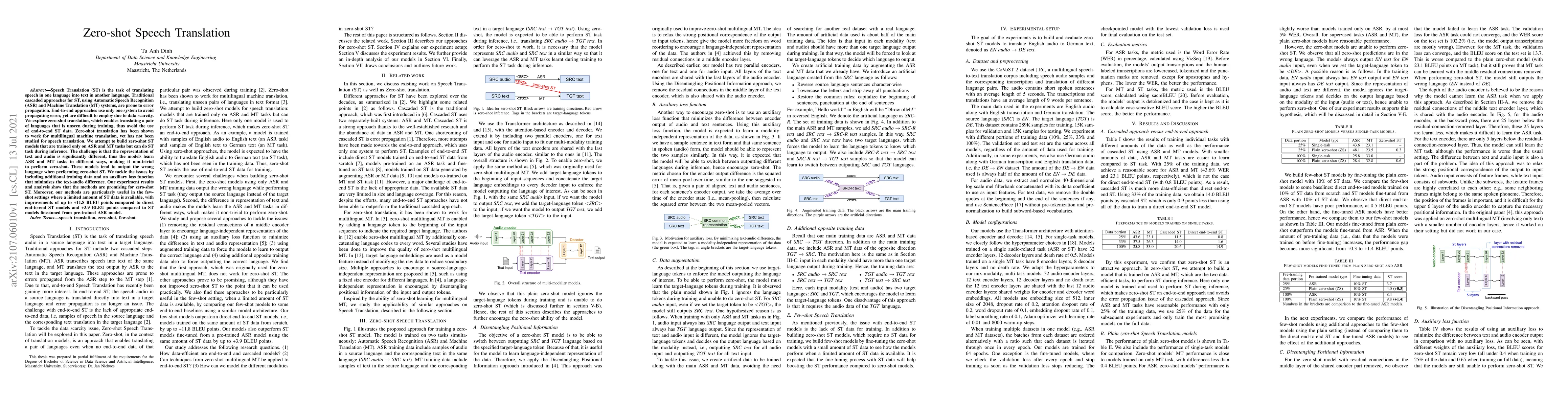 This paper investigates zero-shot speech translation (ST) models that translate unseen language pairs without training data for direct ST. The authors propose methods that leverage ASR and MT data to overcome the challenge of different text-audio representations, achieving promising results with notable improvements in BLEU scores over traditional end-to-end ST models, especially in few-shot settings.