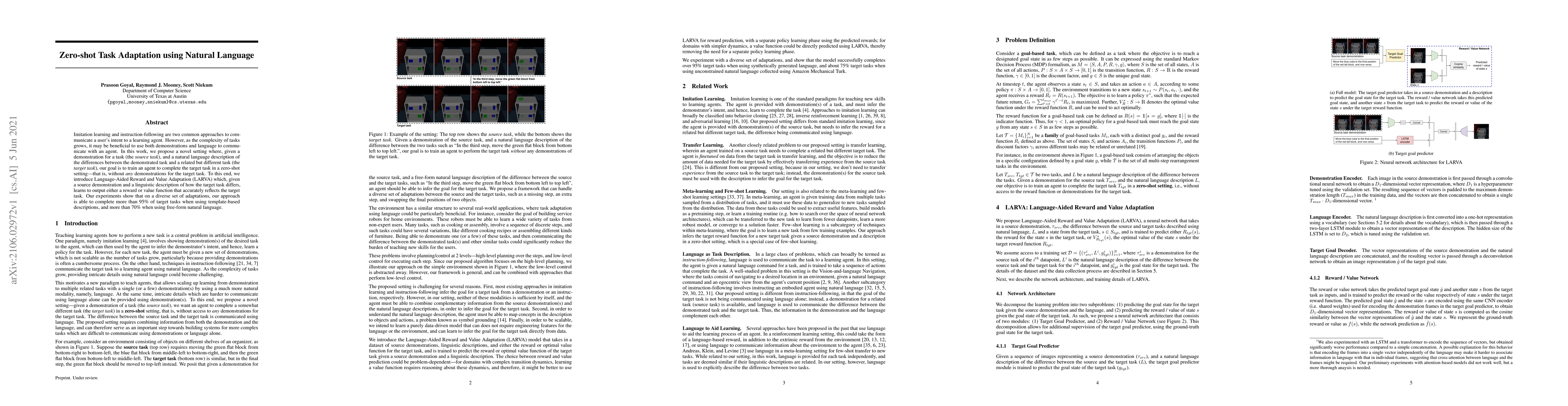 This paper proposes a method for zero-shot task adaptation using both demonstrations and natural language descriptions to train an agent to complete new tasks without direct demonstrations. The introduced LARVA framework combines source demonstrations with linguistic task differences to generate reward/value functions for the target task, achieving high success rates in experiments.