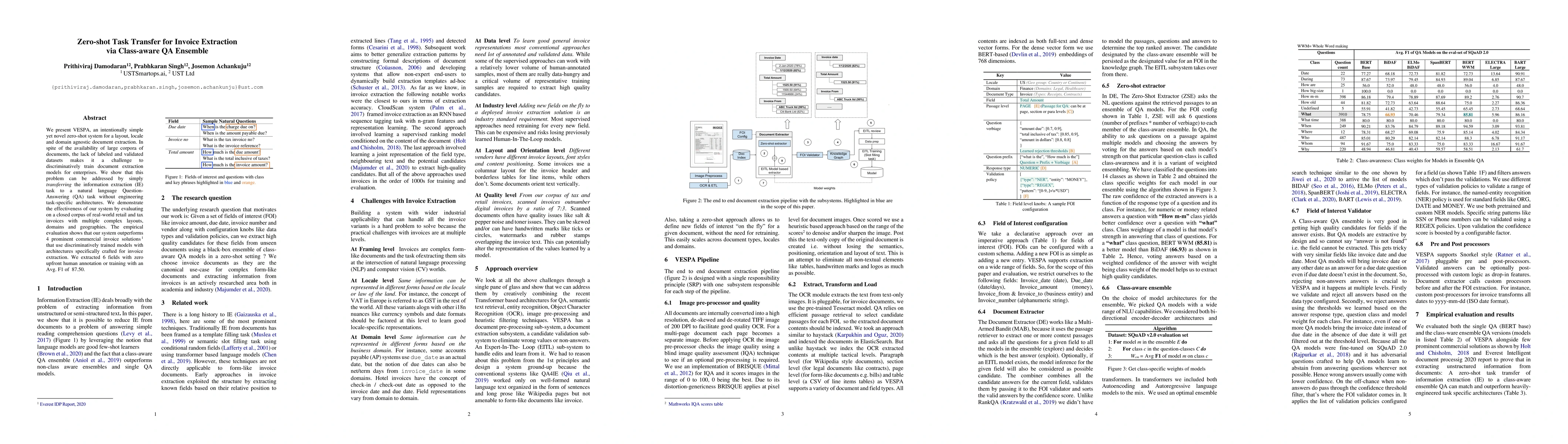 We present VESPA, an intentionally simple yet novel zero-shot system for layout, locale, and domain agnostic document extraction. In spite of the availability of large corpora of documents, the lack of labeled and validated datasets makes it a challenge to discriminatively train document extraction models for enterprises. We show that this problem can be addressed by simply transferring the information extraction (IE) task to a natural language Question-Answering (QA) task without engineering task-specific architectures. We demonstrate the effectiveness of our system by evaluating on a closed corpus of real-world retail and tax invoices with multiple complex layouts, domains, and geographies. The empirical evaluation shows that our system outperforms 4 prominent commercial invoice solutions that use discriminatively trained models with architectures specifically crafted for invoice extraction. We extracted 6 fields with zero upfront human annotation or training with an Avg. F1 of 87.50.