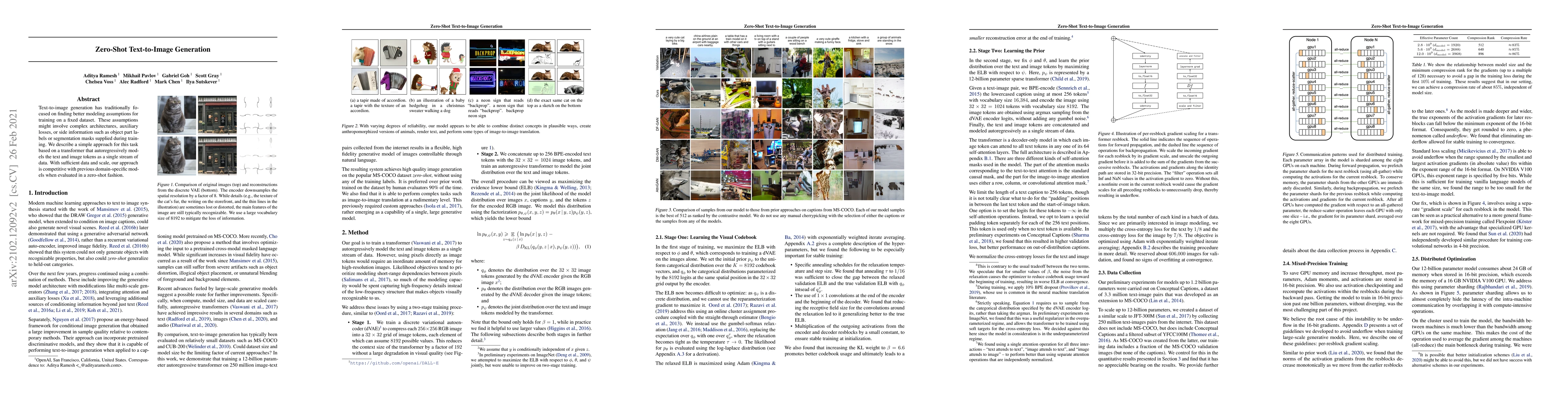 This paper proposes a transformer-based method for zero-shot text-to-image generation, modeling text and image tokens jointly. Despite its simplicity, the approach achieves competitive performance without domain-specific training.