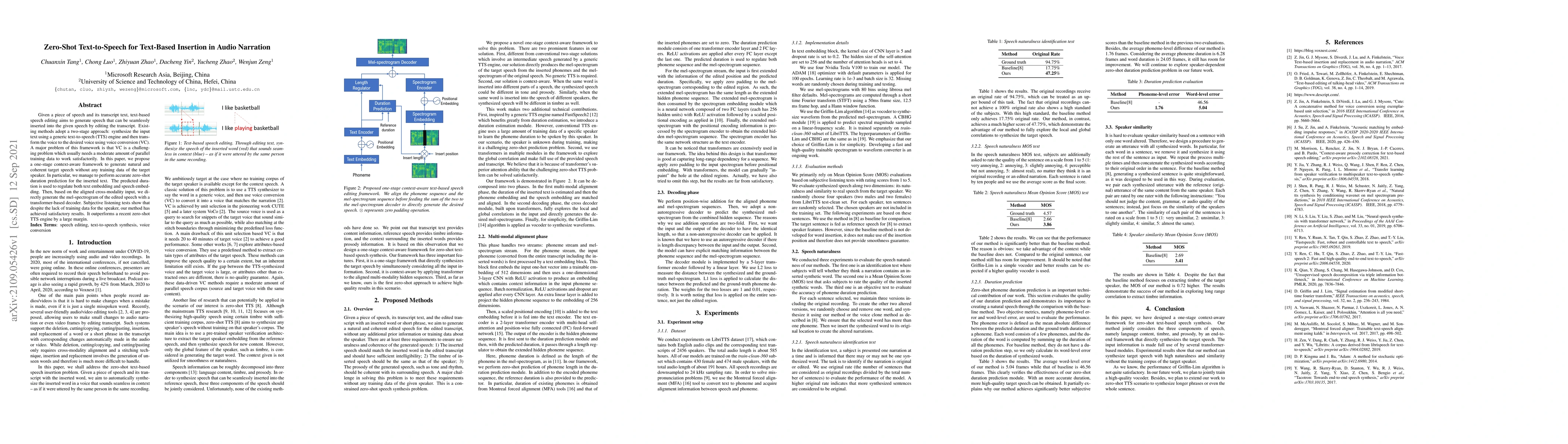 This paper proposes a one-stage context-aware framework for zero-shot text-to-speech that allows seamless insertion of speech into existing audio without requiring parallel training data for the target speaker, achieving natural and coherent results through accurate zero-shot duration prediction and a transformer-based decoder.