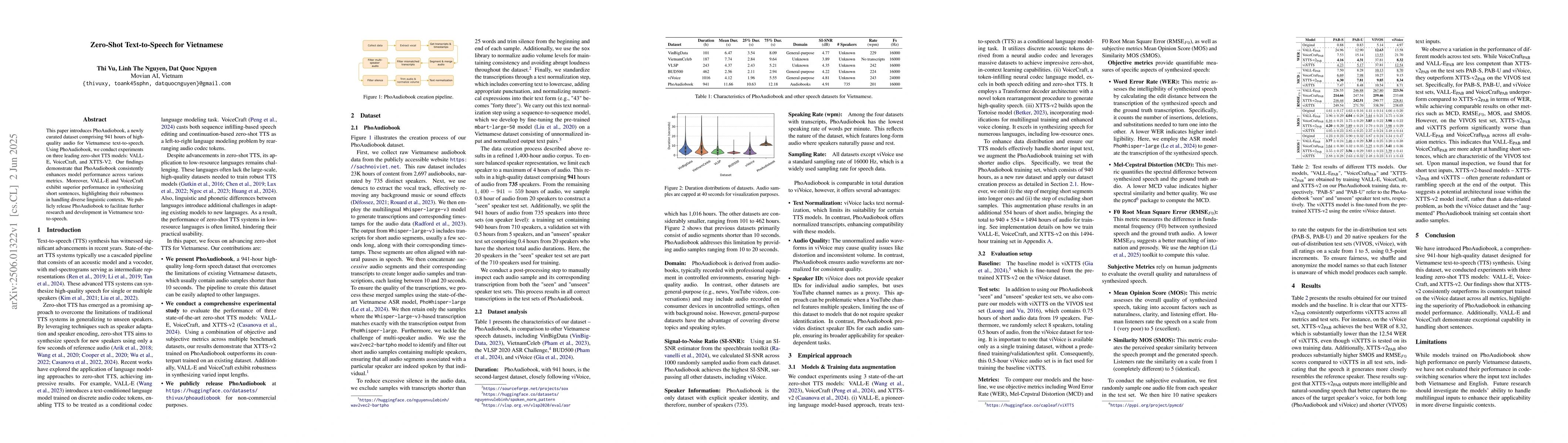 PhoAudiobook dataset and comparative analysis of zero-shot TTS models for Vietnamese.