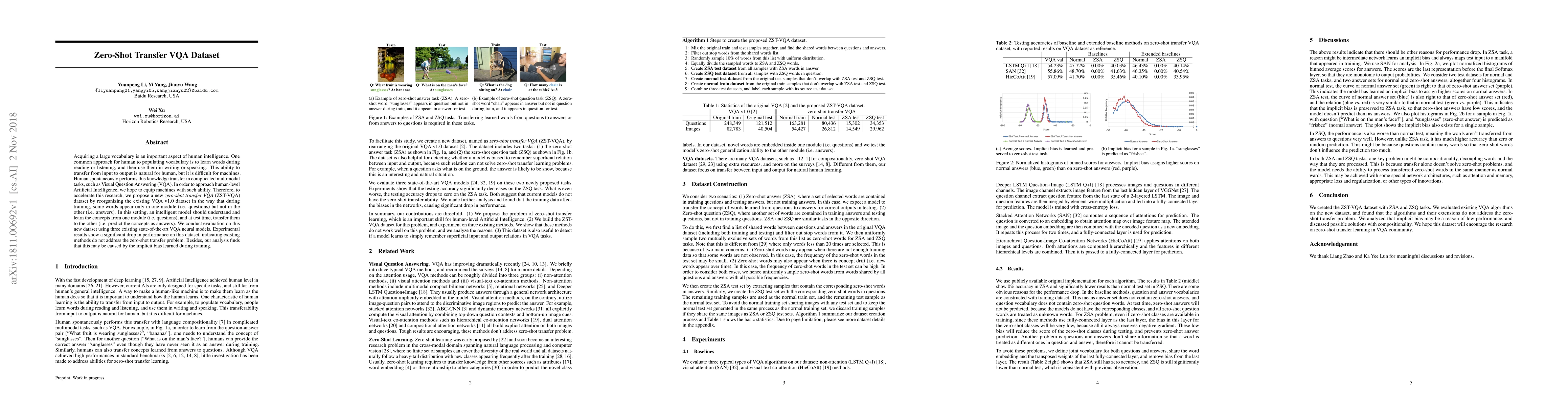 Acquiring a large vocabulary is an important aspect of human intelligence. Onecommon approach for human to populating vocabulary is to learn words duringreading or listening, and then use them in writing or speaking. This ability totransfer from input to output is natural for human, but it is difficult for machines.Human spontaneously performs this knowledge transfer in complicated multimodaltasks, such as Visual Question Answering (VQA). In order to approach human-levelArtificial Intelligence, we hope to equip machines with such ability. Therefore, toaccelerate this research, we propose a newzero-shot transfer VQA(ZST-VQA)dataset by reorganizing the existing VQA v1.0 dataset in the way that duringtraining, some words appear only in one module (i.e. questions) but not in theother (i.e. answers). In this setting, an intelligent model should understand andlearn the concepts from one module (i.e. questions), and at test time, transfer themto the other (i.e. predict the concepts as answers). We conduct evaluation on thisnew dataset using three existing state-of-the-art VQA neural models. Experimentalresults show a significant drop in performance on this dataset, indicating existingmethods do not address the zero-shot transfer problem. Besides, our analysis findsthat this may be caused by the implicit bias learned during training.