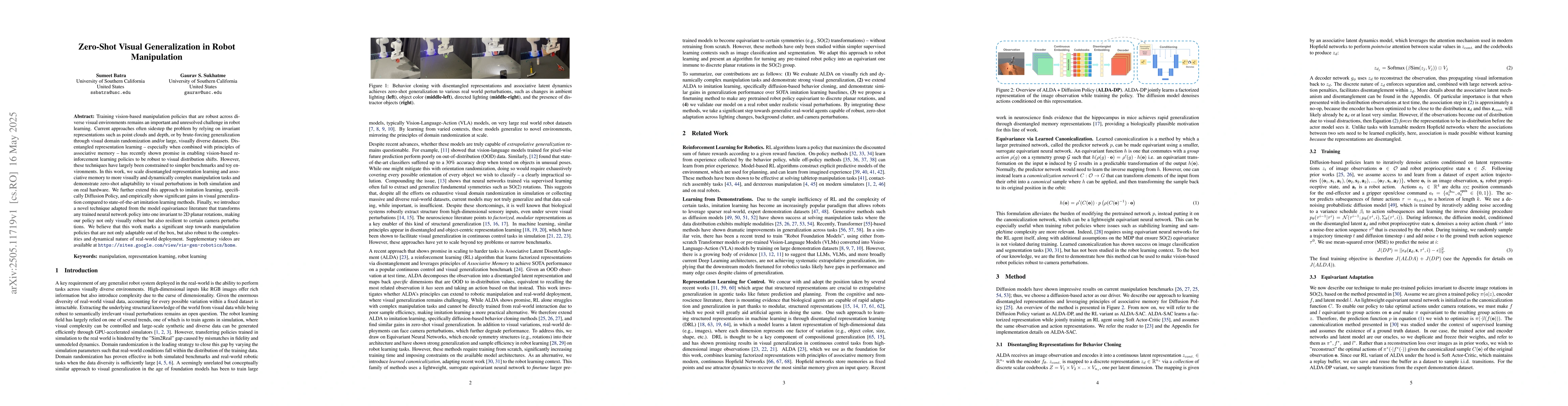 The research scales disentangled representation learning and associative memory to complex manipulation tasks, demonstrating zero-shot adaptability to visual perturbations in both simulation and real hardware. It extends this approach to imitation learning, specifically Diffusion Policy, and introduces a technique to transform trained neural network policies into rotation-invariant forms.
