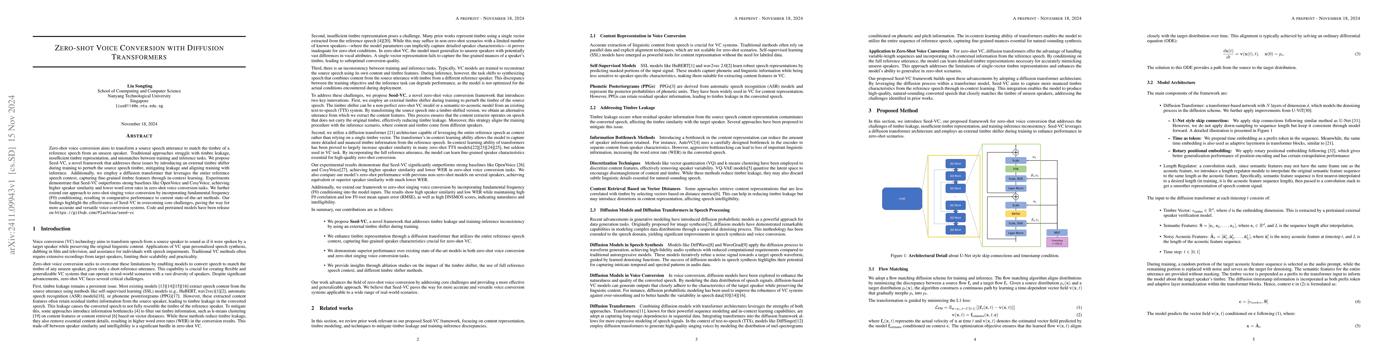 Seed-VC introduces a novel framework for zero-shot voice conversion using a diffusion transformer and an external timbre shifter to address timbre leakage and misalignment, achieving superior performance over baselines. It extends to singing voice conversion with F0 conditioning, demonstrating state-of-the-art comparative results.