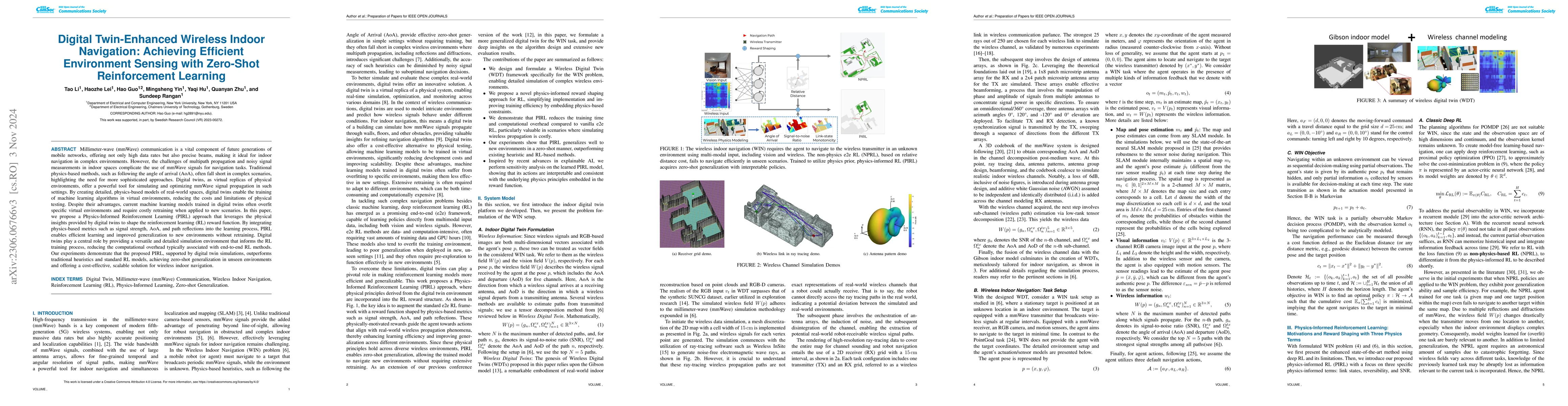 This paper proposes a physics-informed reinforcement learning (PIRL) approach for zero-shot wireless indoor navigation, leveraging physics laws to generalize across complex environments. The method outperforms both end-to-end RL and heuristic-based navigation in terms of performance and generalization, as demonstrated through simulations using a wireless digital twin.