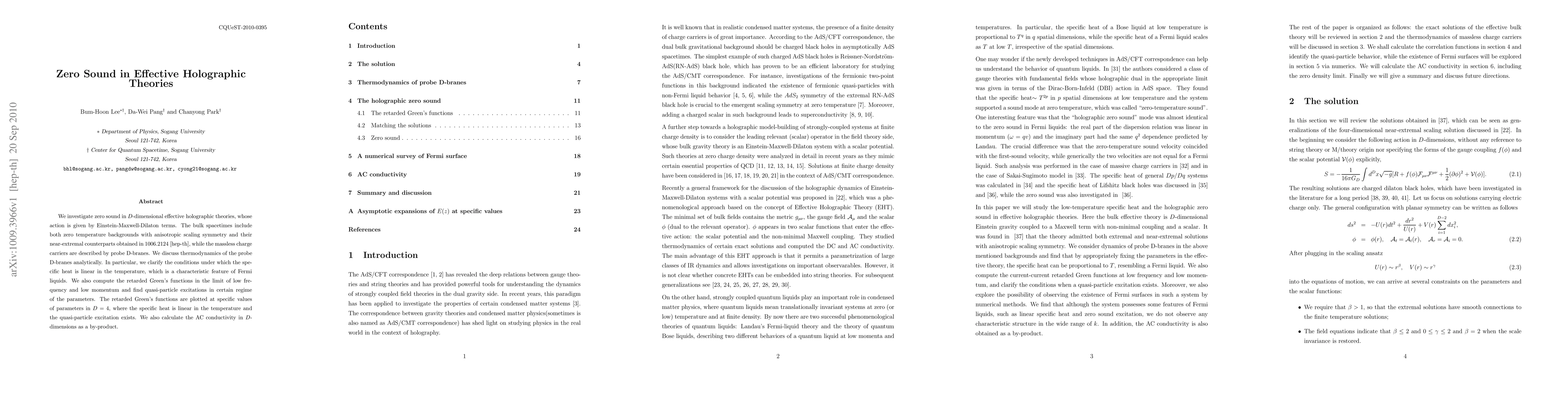 This research explores zero sound in holographic theories with Einstein-Maxwell-Dilaton terms, analyzing both zero temperature and near-extremal backgrounds. It derives conditions for Fermi liquid behavior, calculates quasi-particle excitations, and plots retarded Green's functions in D=4 dimensions, also computing AC conductivity in D-dimensions.