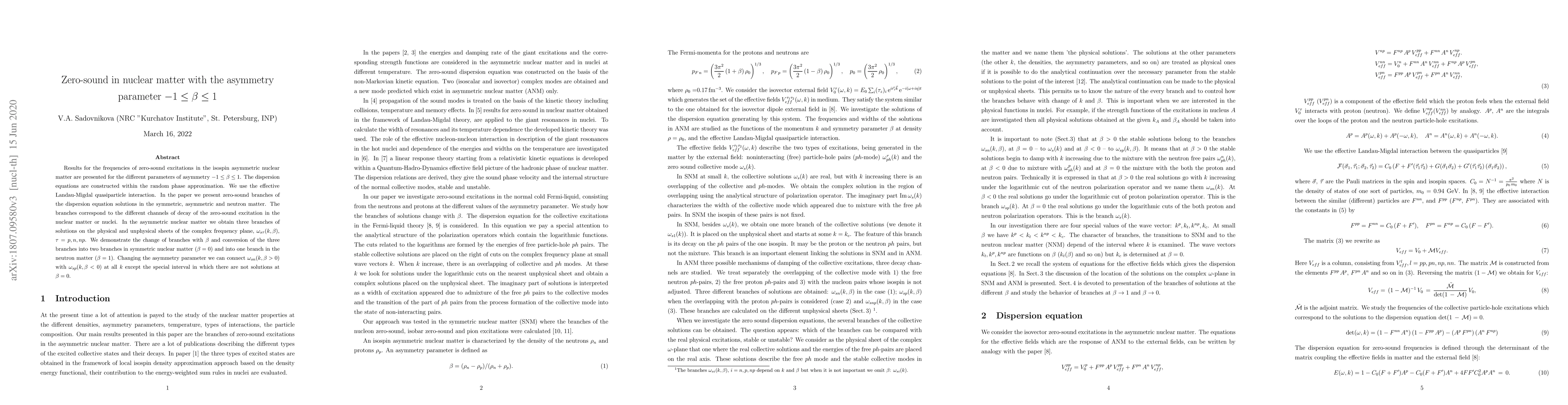Results for the frequencies of zero-sound excitations in the isospin asymmetric nuclear matter are presented for the different parameters of asymmetry -1\leq\beta\leq 1. The dispersion equations are constructed within the random phase approximation. We use the effective Landau-Migdal quasiparticle interaction with the special isospin dependence of the phase volume in the normalization factor C_0. In the paper we present zero-sound branches of the dispersion equation solutions in the symmetric, asymmetric and neutron matter. The branches correspond to the different channels of decay of the zero-sound excitation in the nuclear matter or nuclei. In the asymmetric nuclear matter we obtain three branches of solutions on the physical and unphysical sheets of the complex frequency plane, \omega_{s\,\tau}(k,\beta), \tau=p,n,np. We demonstrate the change of branches with \beta and conversion of the three branches into two branches in symmetric nuclear matter (\beta=0) and into one branch in the neutron matter (\beta=1).