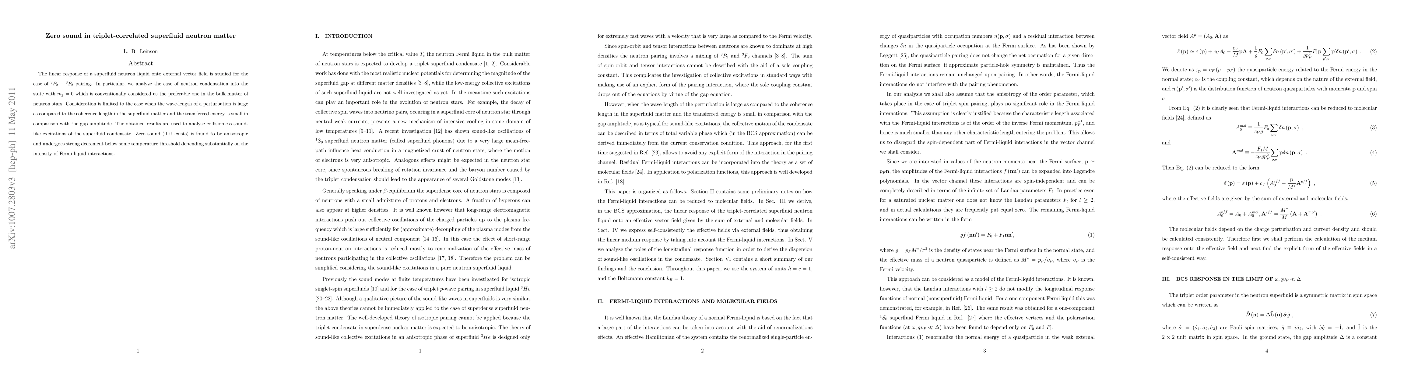 Researchers investigated zero sound in a superfluid neutron liquid, finding it to exist as anisotropic excitations that decrease below a certain temperature threshold depending on the intensity of Fermi-liquid interactions.