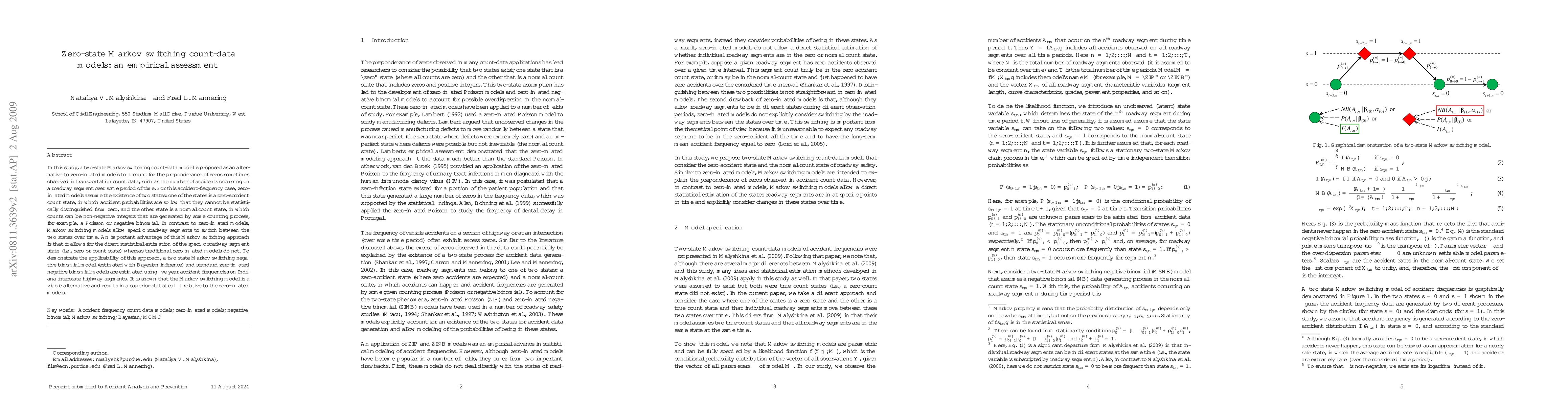In this study, a two-state Markov switching count-data model is proposed as an alternative to zero-inflated models to account for the preponderance of zeros sometimes observed in transportation count data, such as the number of accidents occurring on a roadway segment over some period of time. For this accident-frequency case, zero-inflated models assume the existence of two states: one of the states is a zero-accident count state, in which accident probabilities are so low that they cannot be statistically distinguished from zero, and the other state is a normal count state, in which counts can be non-negative integers that are generated by some counting process, for example, a Poisson or negative binomial. In contrast to zero-inflated models, Markov switching models allow specific roadway segments to switch between the two states over time. An important advantage of this Markov switching approach is that it allows for the direct statistical estimation of the specific roadway-segment state (i.e., zero or count state) whereas traditional zero-inflated models do not. To demonstrate the applicability of this approach, a two-state Markov switching negative binomial model (estimated with Bayesian inference) and standard zero-inflated negative binomial models are estimated using five-year accident frequencies on Indiana interstate highway segments. It is shown that the Markov switching model is a viable alternative and results in a superior statistical fit relative to the zero-inflated models.