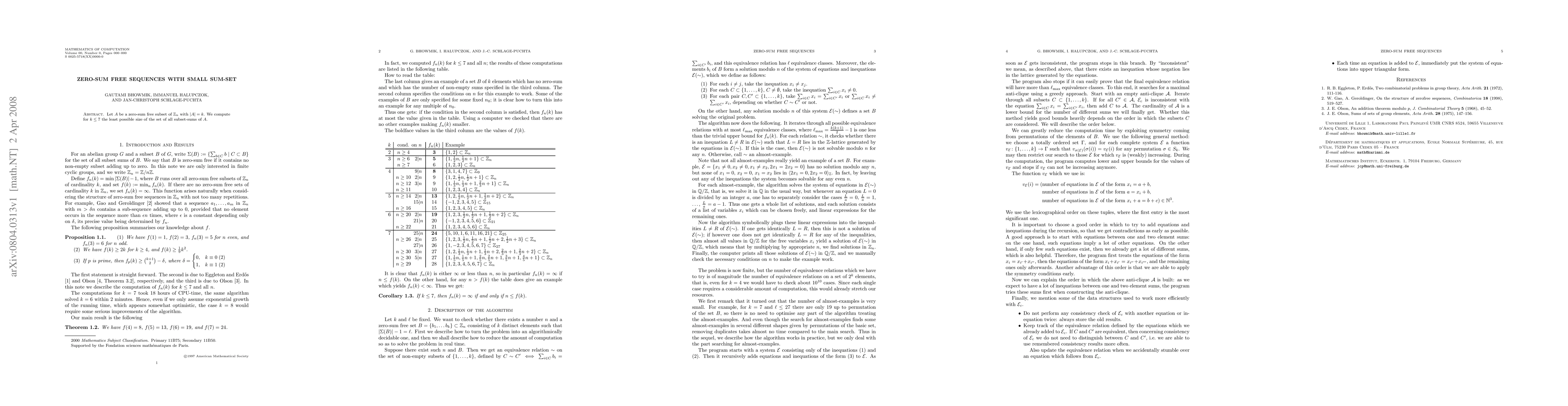 Let A be a zero-sum free subset of Z_n with |A|=k. We compute for k\le 7 the least possible size of the set of all subset-sums of A.