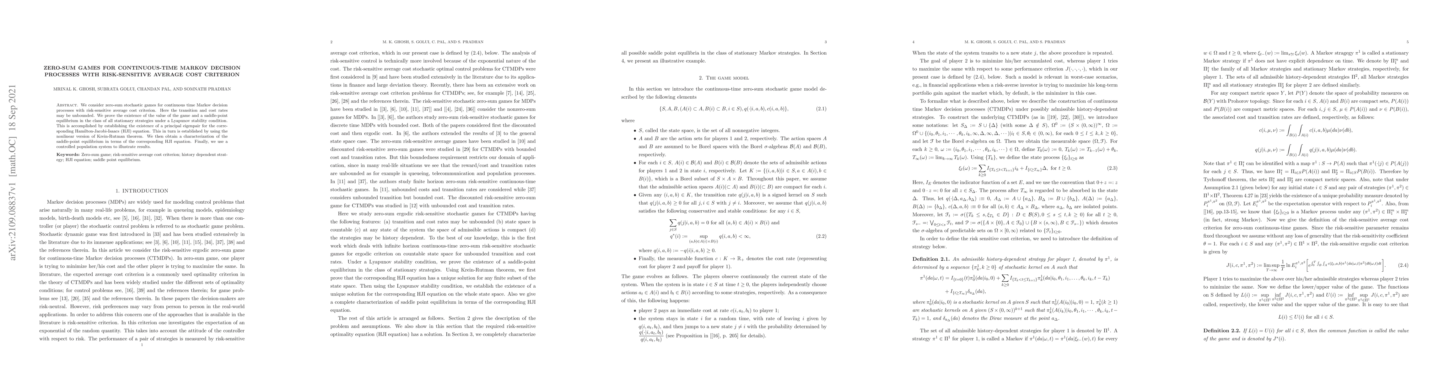 This paper explores zero-sum stochastic games in continuous-time Markov decision processes with a risk-sensitive average cost criterion, proving the existence of a value and saddle-point equilibrium under Lyapunov stability. It achieves this by demonstrating the existence of a principal eigenpair for the Hamilton-Jacobi-Isaacs equation, leveraging the nonlinear Krein-Rutman theorem.
